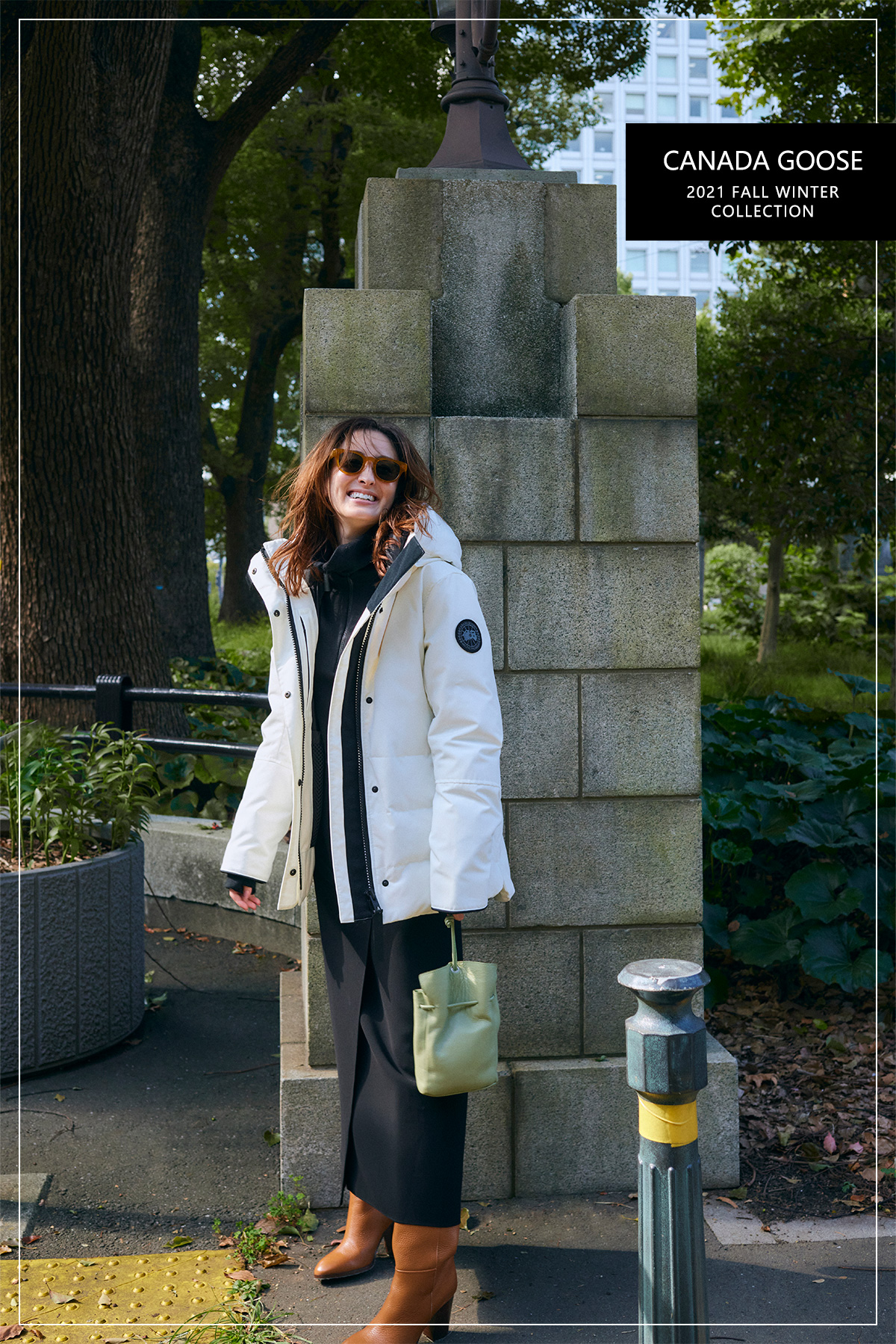 カナダグースらしいハリのあるしっかりした素材で、ダウンでもすっきりとシャープな見た目を実現。ウエストのコードでフィット感を調節できるので、キレイめスタイルにもすんなりフィットします。 ダウンジャケット¥107,800ニット¥46,200(ともにカナダグース)スカート¥22,000(エストネーション)バッグ¥16,830(NOMADIS/TOMORROWLAND)ロングブーツ¥53,900(ファビオ ルスコーニ/ファビオ ルスコーニ ルミネ有楽町店)サングラス¥53,900(アイヴァン 7285/アイヴァン 7285 トウキョウ)