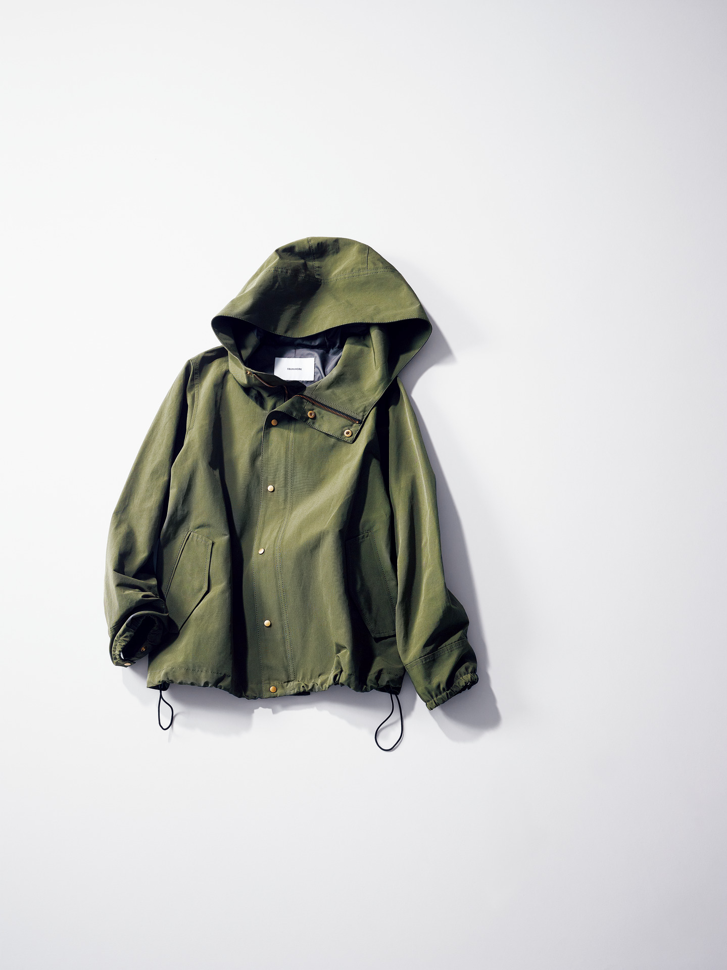 女性らしいAラインシルエット。ゴールドジップ&ボタンが上品見えの秘密です。マウンテンパーカ¥25,000(フレームワーク/フレームワーク ルミネ新宿店)