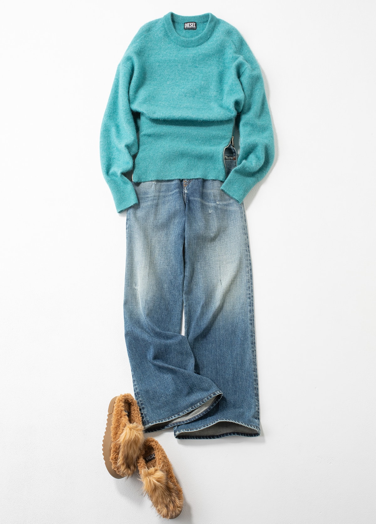 秋冬シーズン、フレッシュに目に映るグリーンニットはリモート映えも確実。アルパカMIXのふかふかした素材で暖かく、両サイドのジップでシルエットを変えられるデザインです。ヴィンテージっぽい風合いのワイドデニムを合わせれば、何気ないワンツーコーデも味のあるオシャレな雰囲気に。