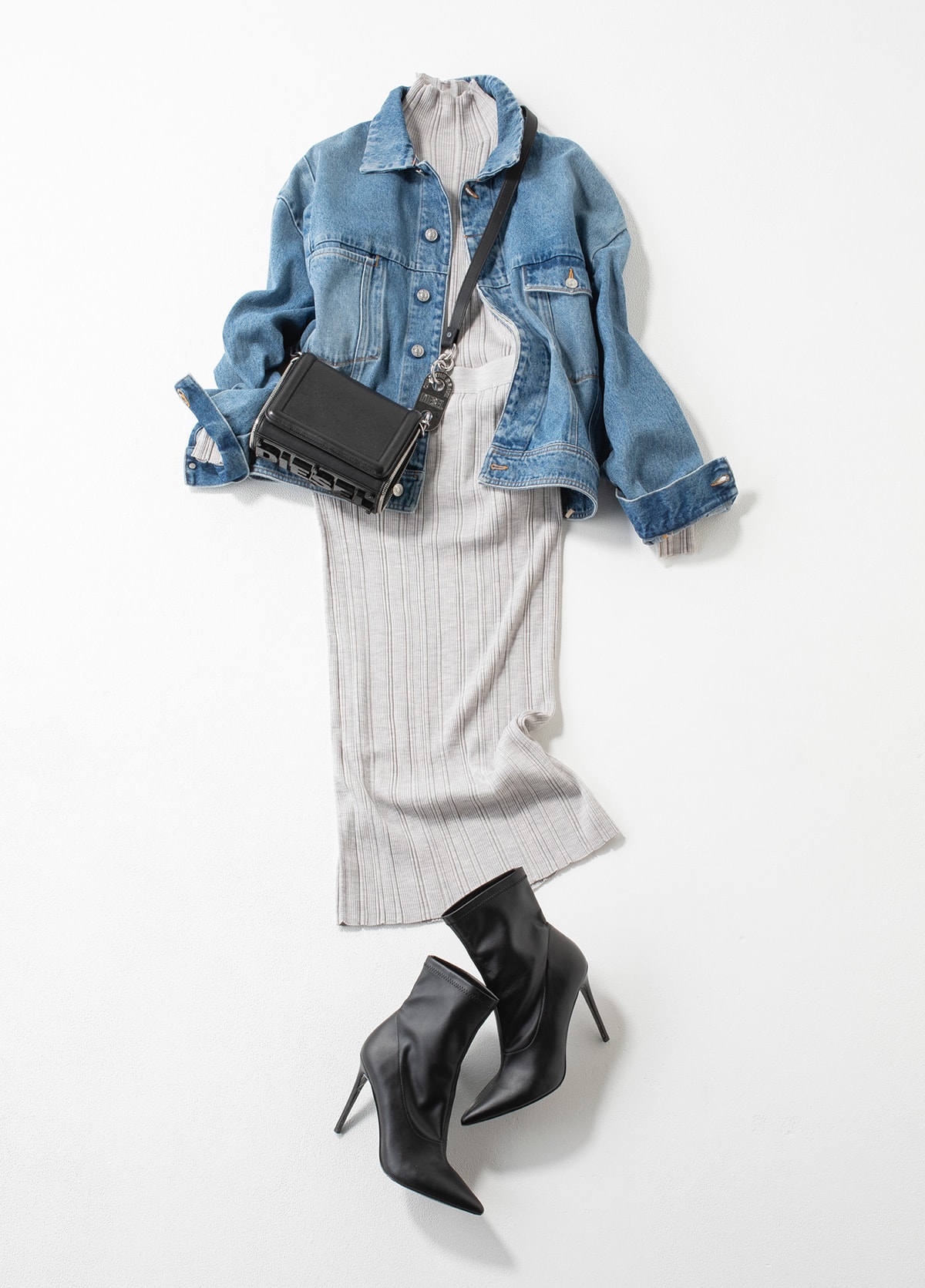キレイめにもカジュアルにも、ON・OFF着回せる、さらっとした細身のリブニットセットアップ。上下それぞれ単品でも使えて、スカートはウエストゴムで楽ちんながら、後ろに深いスリット入りで女らしさをキープ。こなれ感たっぷりのGジャンとエッジィな黒小物を合わせてクールに決めて。