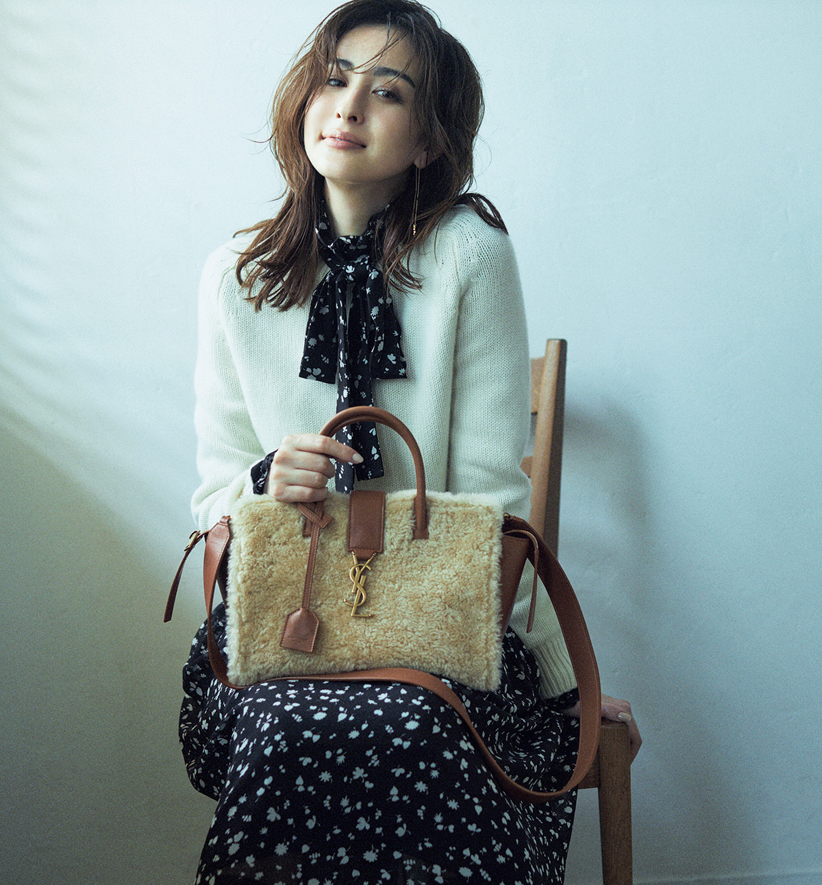 リッチな風合いの大人可愛いシアリングバッグはカジュアルを格上げするだけでなく、レディなスタイルに抜け感をプラスできる遊び心的な存在になってくれること間違いなし。バッグ「DOWNTOWN」〈H19.5×W36×D12㎝〉[ショルダーストラップ取り外し可能]¥372,900ニット¥154,000ワンピース¥341,000ピアス¥49,500(すべてサンローラン バイ アンソニー・ヴァカレロ/サンローラン クライアントサービス)