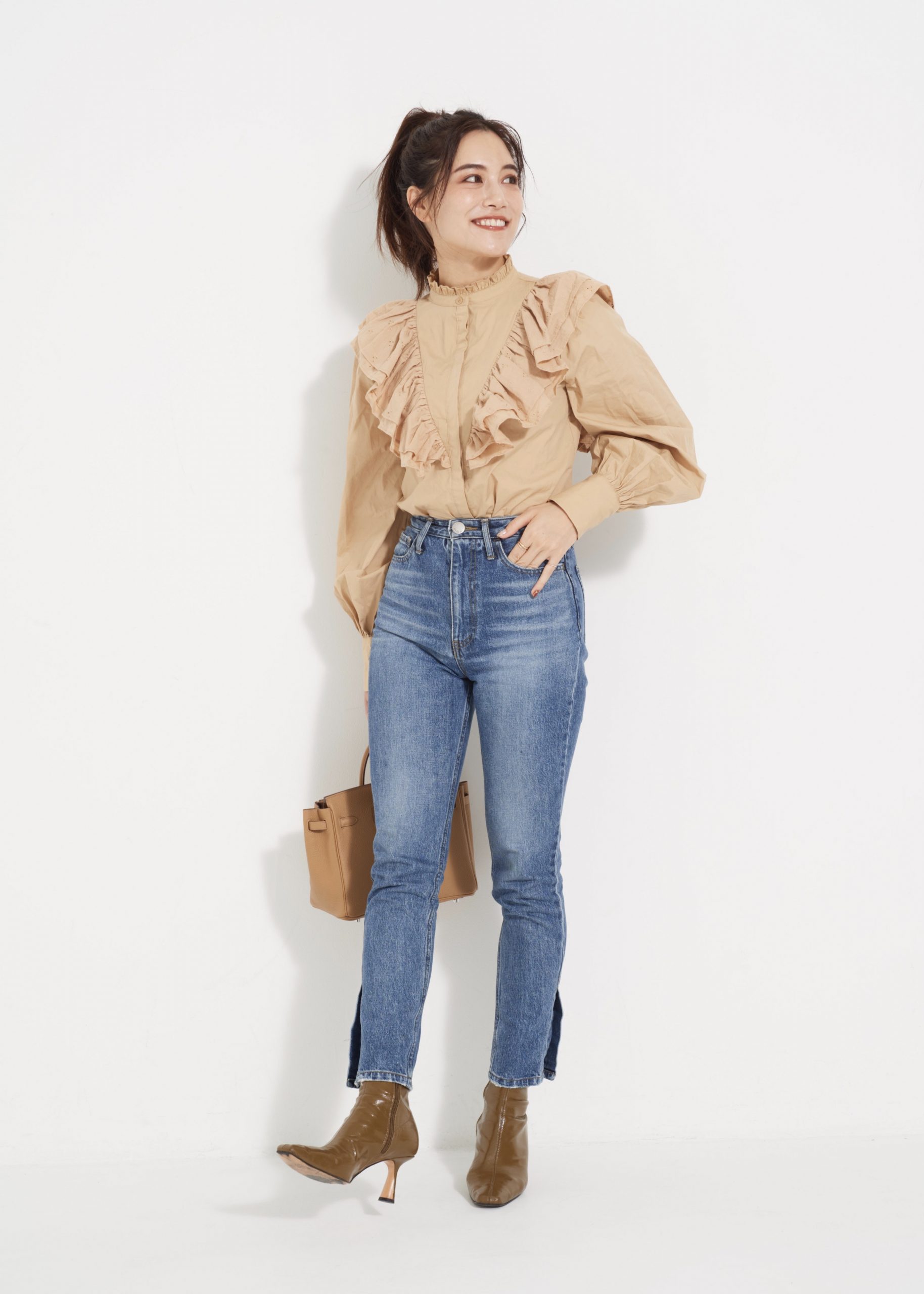 「Her lip toのデニムは、ハイライズのデザインなので、脚を細く長く見せてくれます。絶妙に計算されたポケット位置のおかげで、ヒップアップして見えるのもお気に入りのポイント。カジュアルなデニムには、ボリューミーなフリルブラウスを合わせて、テイストMIXスタイルに。ベージュ×ブラウンでまとめて、デニムが際立つようにコーディネートしました」(石井里奈さん 通信関連会社・32歳 165cm)