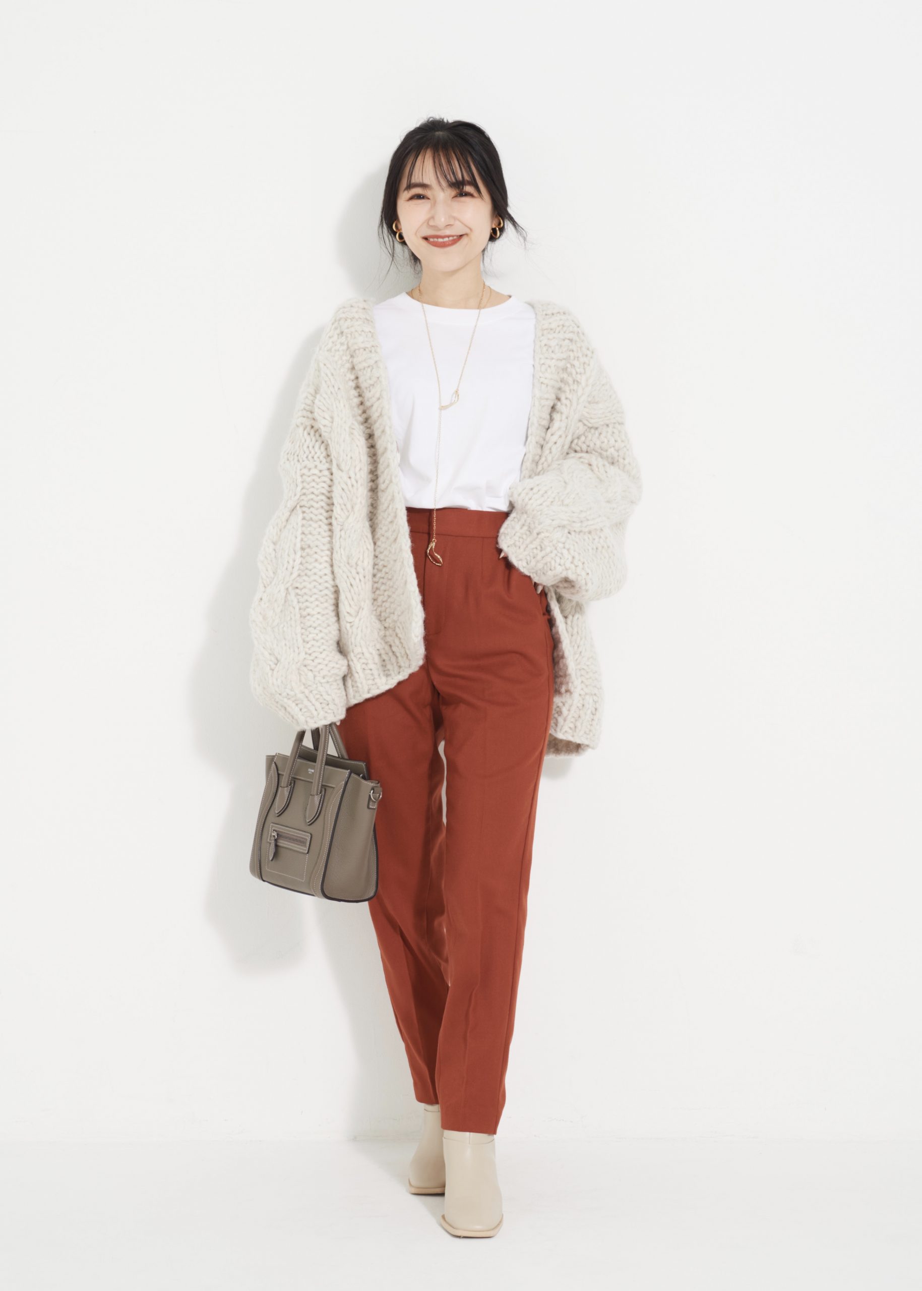 「細見えするセンタープレスパンツは、ウール素材で暖かく、秋らしいテラコッタカラーがお気に入り。Sサイズの私でもスタイルアップして見える、ハイウェスト×センタープレスのデザインのパンツは、普段から意識して取り入れるようにしています。パンツが主役のコーディネートなので、トップスやアウターなどは白〜ベージュでシンプルにまとめました。上半身にボリュームを持ってくることで、上下のシルエットに差がつき、着痩せも叶います」(桐 嵯梨さん 宝飾関係 30歳・156cm)