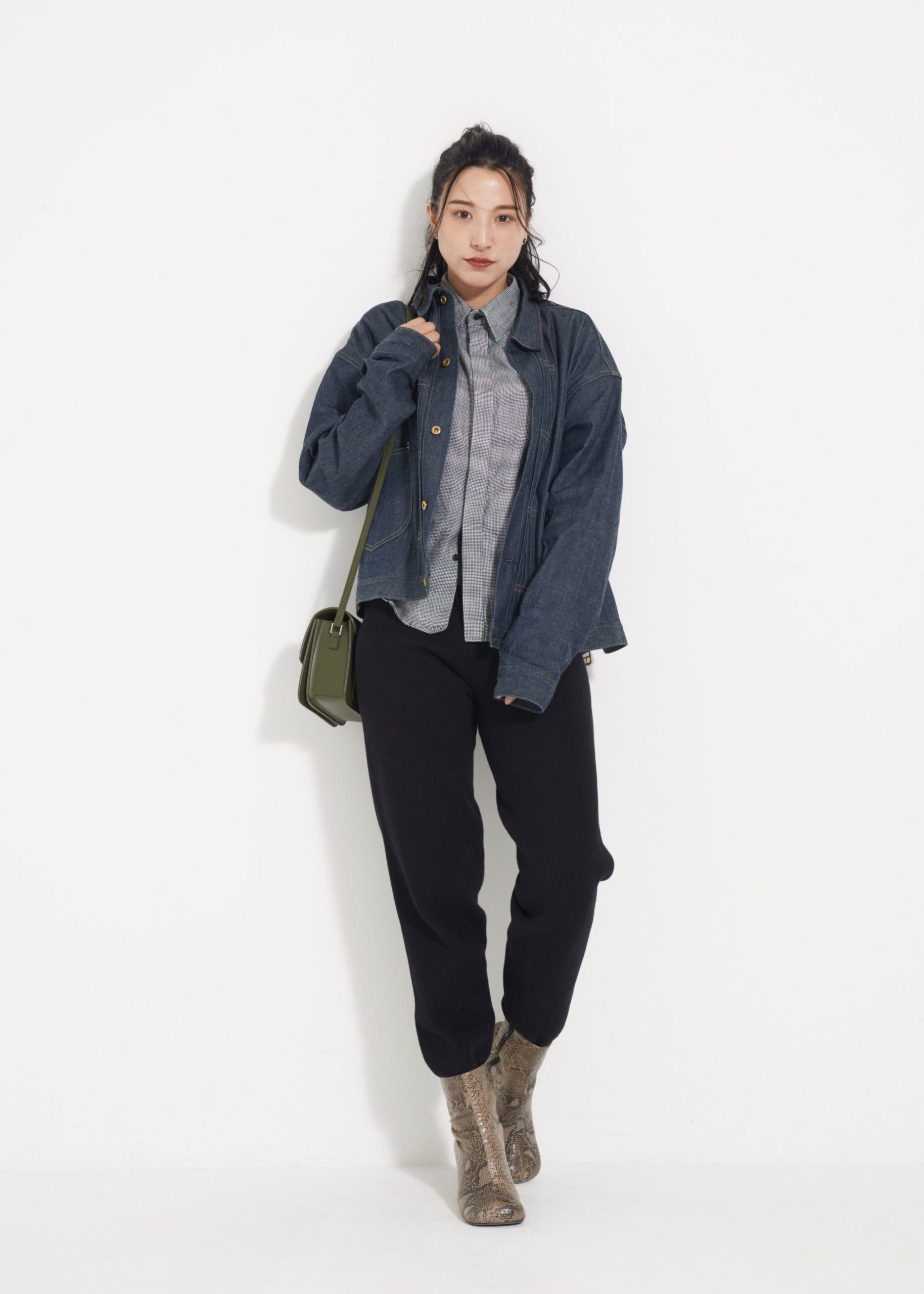「細見えを狙った黒のハイウェストパンツは、ラインがキレイでカジュアルになりすぎず、上品に着こなせるので気に入っています。ラフになりがちなスウェット素材のパンツには、チェック柄のシャツで華やかさときちんと感をプラス。脚が長く見えるように、トップスもアウターも短め丈を選んでバランスを取りました」(立花 朋実さん 会社員 31歳・167cm)