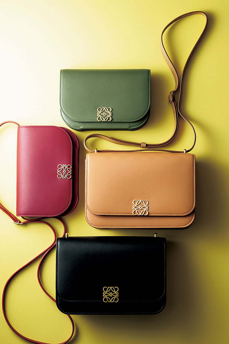 バッグキャメル、ブラック「ゴヤ バッグ」〈H15.5×W22.5×D6.5〉各¥449,900グリーン、レッド「ゴヤ バッグ」〈H12.5×W18.5×D2.9〉各¥257,400(すべてロエベ/ロエベ ジャパン クライアントサービス)