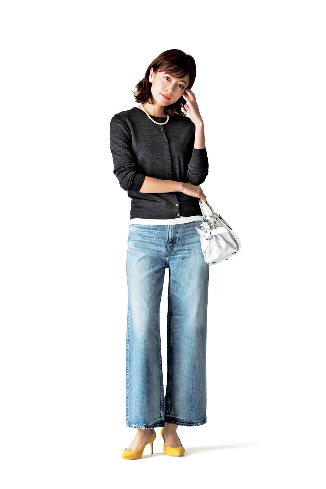 ニットカーディガン¥2,990(UNIQLO)Tシャツ¥2,500(プチバトー/プチバトー・カスタマーセンター)デニムパンツ¥23,000(アッパーハイツ/ゲストリスト)バッグ¥41,000(POTIOR/ショールーム セッション)パンプス¥40,000(ロランス/ザ・グランドインク)ネックレス¥29,167(アビステ)