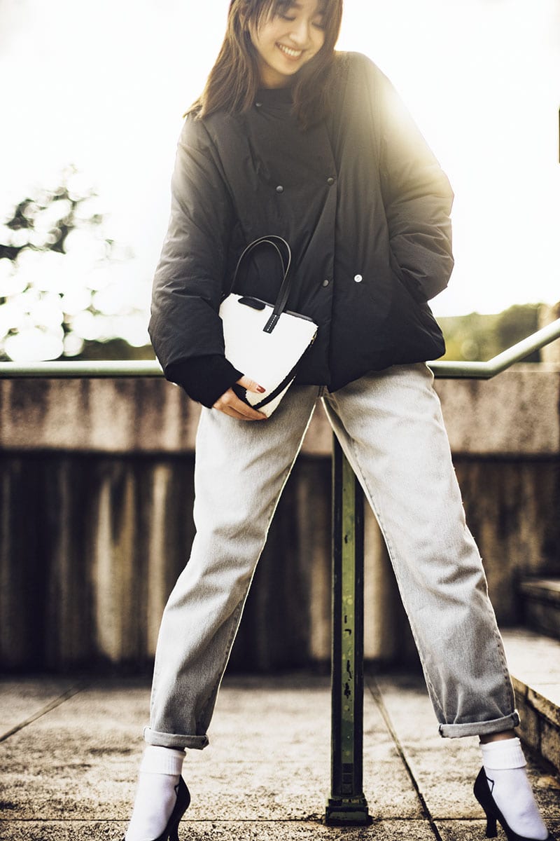 羽毛製品の回収→羽毛の精製を経たリサイクルダウンを使用。重さ約460gで軽やかな着心地。ジャケット¥19,800(グリーンレーベル リラクシング/ユナイテッドアローズ グリーンレーベル リラクシング自由が丘店)ニット¥35,200(スローン)パンツ¥26,400ソックス¥2,200 バッグ¥23,100(すべてダブルスタンダードクロージング/フィルム)パンプス¥14,850(ダイアナ/ダイアナ銀座本店)