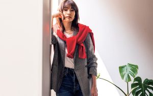 ジャケット¥41,800(ユナイテッド アローズ/ユナイテッドアローズ 有楽町店)Tシャツ¥10,450(THIRD MAGAZINE/THIRD MAGAZINE)肩にかけたカーディガン¥16,500(マカフィー/TOMORROWLAND)デニムパンツ¥36,300(シチズンズ・オブ・ヒューマニティ/シチズンズ・オブ・ヒューマニティ)ハット¥25,740(CA4LA/CA4LA プレスルーム)パールネックレス¥48,400(マリハ)ピアス¥74,800(ウノアエレ/ウノアエレ ジャパン)パンプス¥51,700(ネブローニ/フラッパーズ)ファーバッグ¥31,900(2.718/ガリャルダ ガランテ 表参道店)