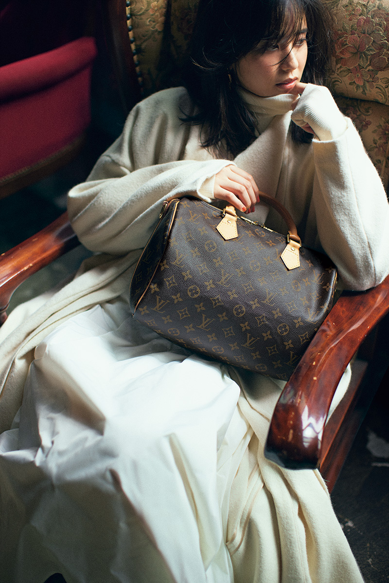 日本の家紋からヒントを得たという、丸みを帯びたモチーフは、甘さのあるコーディネートにマッチします。〝スピーディ 30バンドリエール〟バッグ〈H21×W30×D17㎝〉¥210,100(ルイ・ヴィトン クライアントサービス)コート¥165,000(ebure GINZA SIX店)ニット¥19,800(ウィムガゼット/ウィム ガゼット ルミネ新宿店)スカート¥26,400(エストネーション/エストネーション)