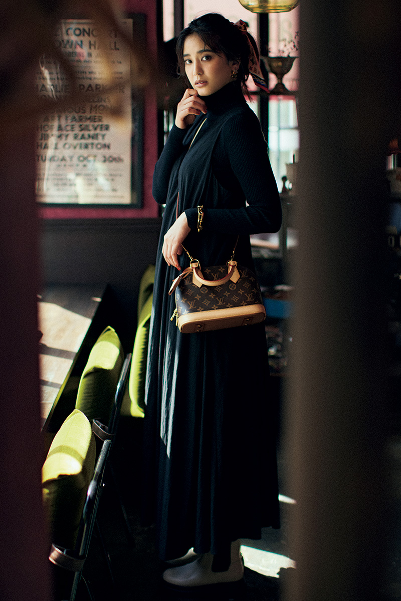 パリのセーヌ川に架かる橋が由来である〝アルマ〟。モノグラム柄と丸みのあるフォルムがいつものコーデに品を与えてくれます。〝アルマBB〟バッグ〈H17.5×W23.5×D11.5㎝〉¥195,800 ピアス¥73,700 ブレスレット¥99,000 スカーフ〈120×5㎝〉¥27,500(すべてルイ・ヴィトン クライアントサービス) ワンピース¥39,600(ELE STOLYOF) ニット¥25,300(スローン) ブーツ¥12,980(シップス エニィ/シップス エニィ 渋谷店)