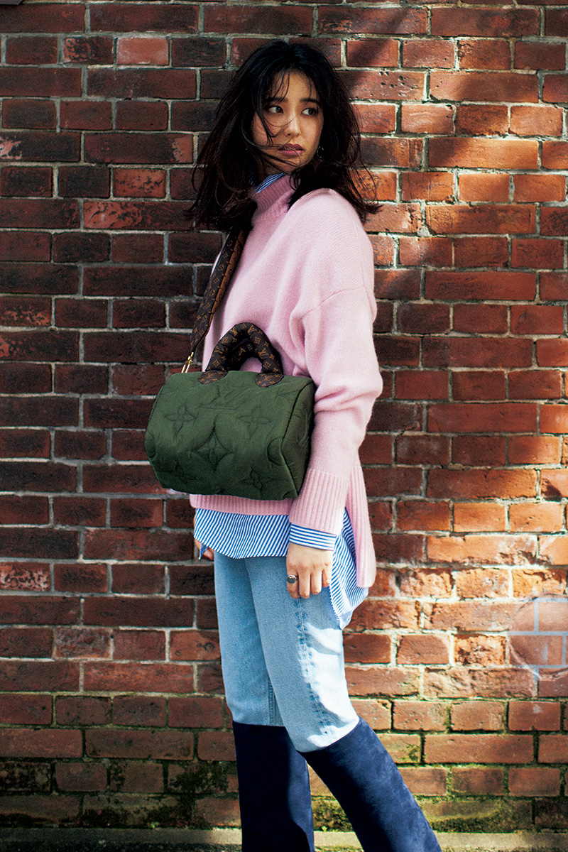 大ぶりのモノグラムとパフィな素材感が大人の愛らしさを発揮。〝スピーディ 25バンドリエール〟バッグ〈H19×W25×D15㎝〉¥256,300(ルイ・ヴィトン クライアントサービス)ニット¥48,400(LE PHIL/LE PHIL NEWoMan新宿店) ストライプシャツ¥28,600(インディヴィジュアライズドシャツ/シップス プライマリー ネイビー レーベル)パンツ¥27,500(エー・ゴールド・イー/シチズンズ・オブ・ヒューマニティ)ピアス¥12,980(フィリップ オーディベール/シップス 渋谷店)リング¥25,300(ウノアエレシルバーコレクション/ウノアエレ ジャパン)ブーツ¥90,200(ネブローニ/フラッパーズ)