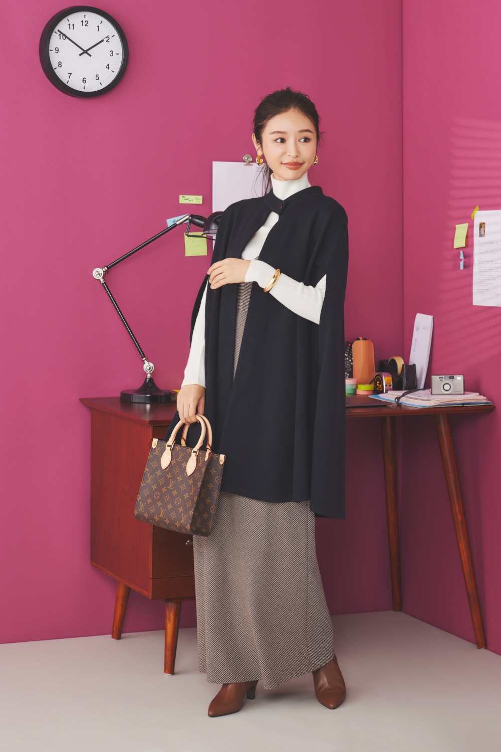週の始まりの出社は、ポンチョコート×ロングブブーツの最旬コンビで、気持ちも着こなしもフレッシュに。時代を超えて愛されてきたモノグラムのバッグは、クラシカルなムードにもフィット。グレンチェックのキャミドレスにトレンドのポンチョをレイヤードして、今季らしいクラシック感を取り入れて。