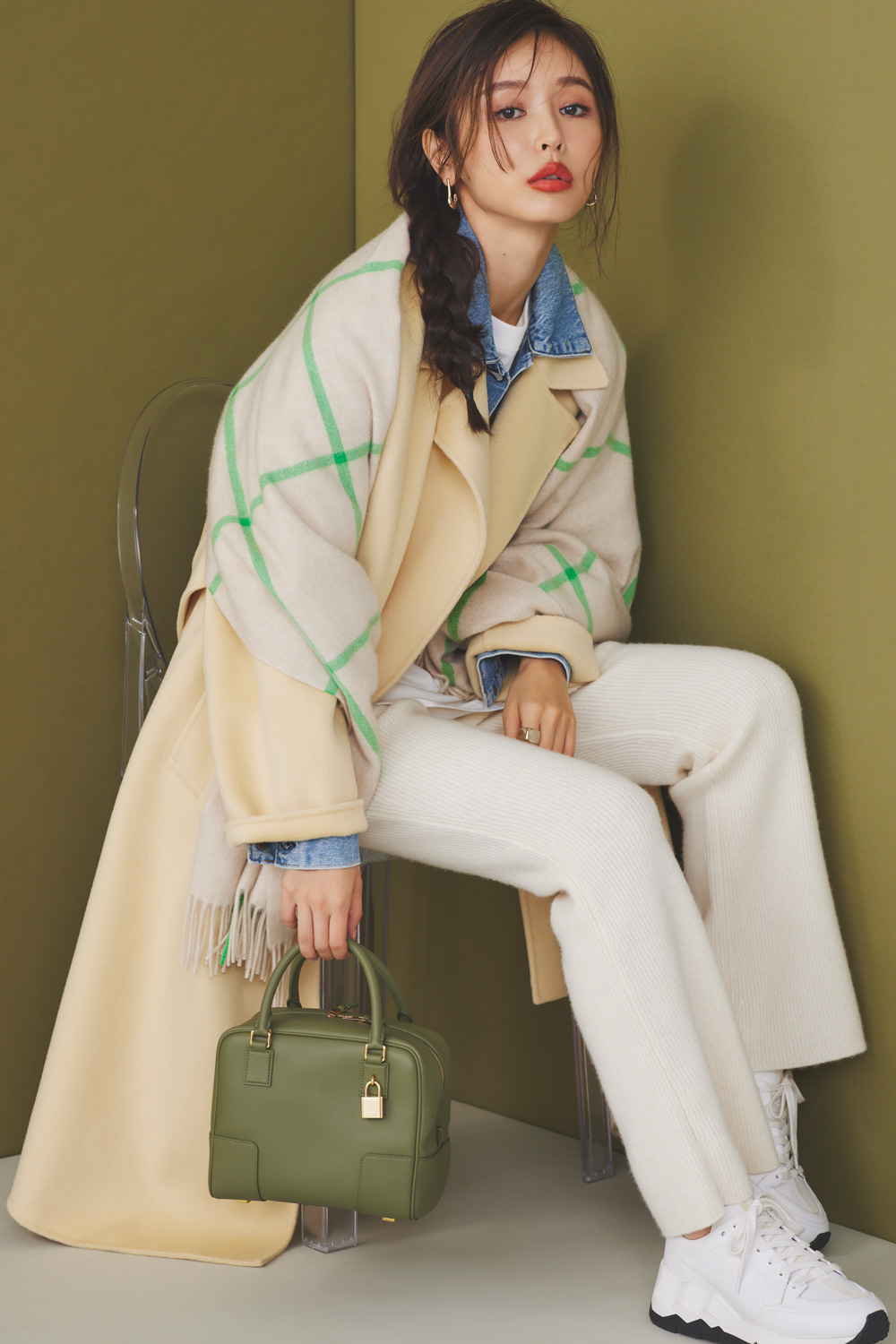 リバーウールガウンコート¥48,400ニットフレアパンツ¥16,500(ともにアダム エ ロペ)デニムジャケット¥27,500(リーバイス® オーソライズド ビンテージ/リーバイ・ストラウス ジャパン)オーバーサイズTシャツ¥12,100(アー・ペー・セー/アー・ペー・セー カスタマーサービス)スニーカー¥93,500(ピエール アルディ/ピエール アルディ 東京)チェック柄ストール¥62,700(ジョシュア・エリス/グリニッジ ショールーム)ピアス※オンラインストア限定¥13,200(アンセム フォー ザ センセズ/アマンオンラインストア)リング¥10,780(アンセム フォー ザ センセズ/アマン)