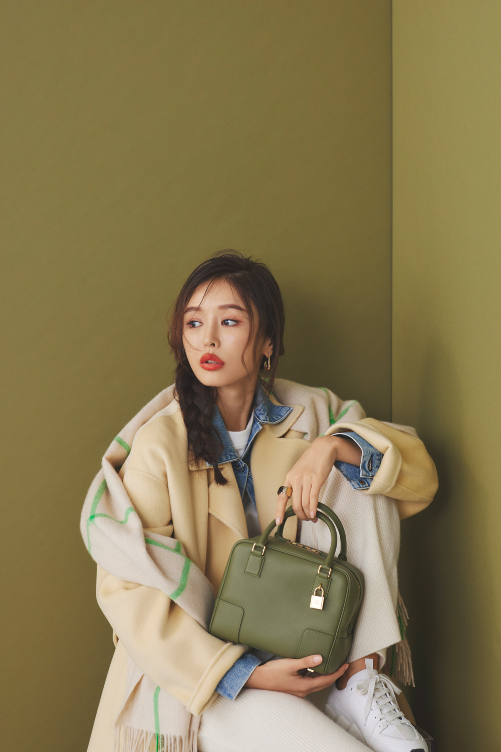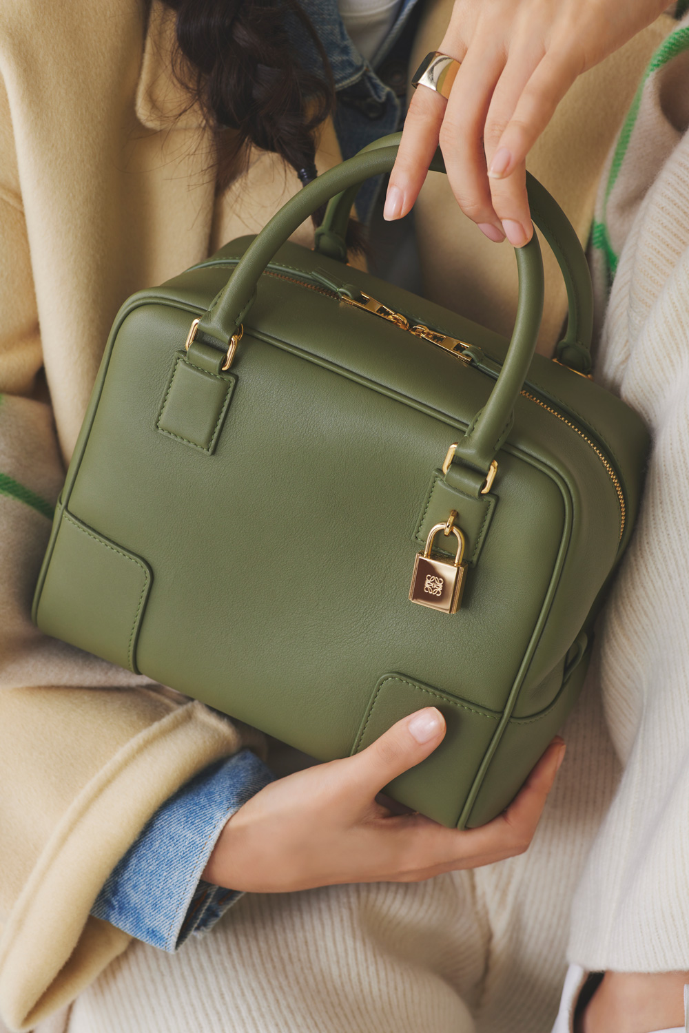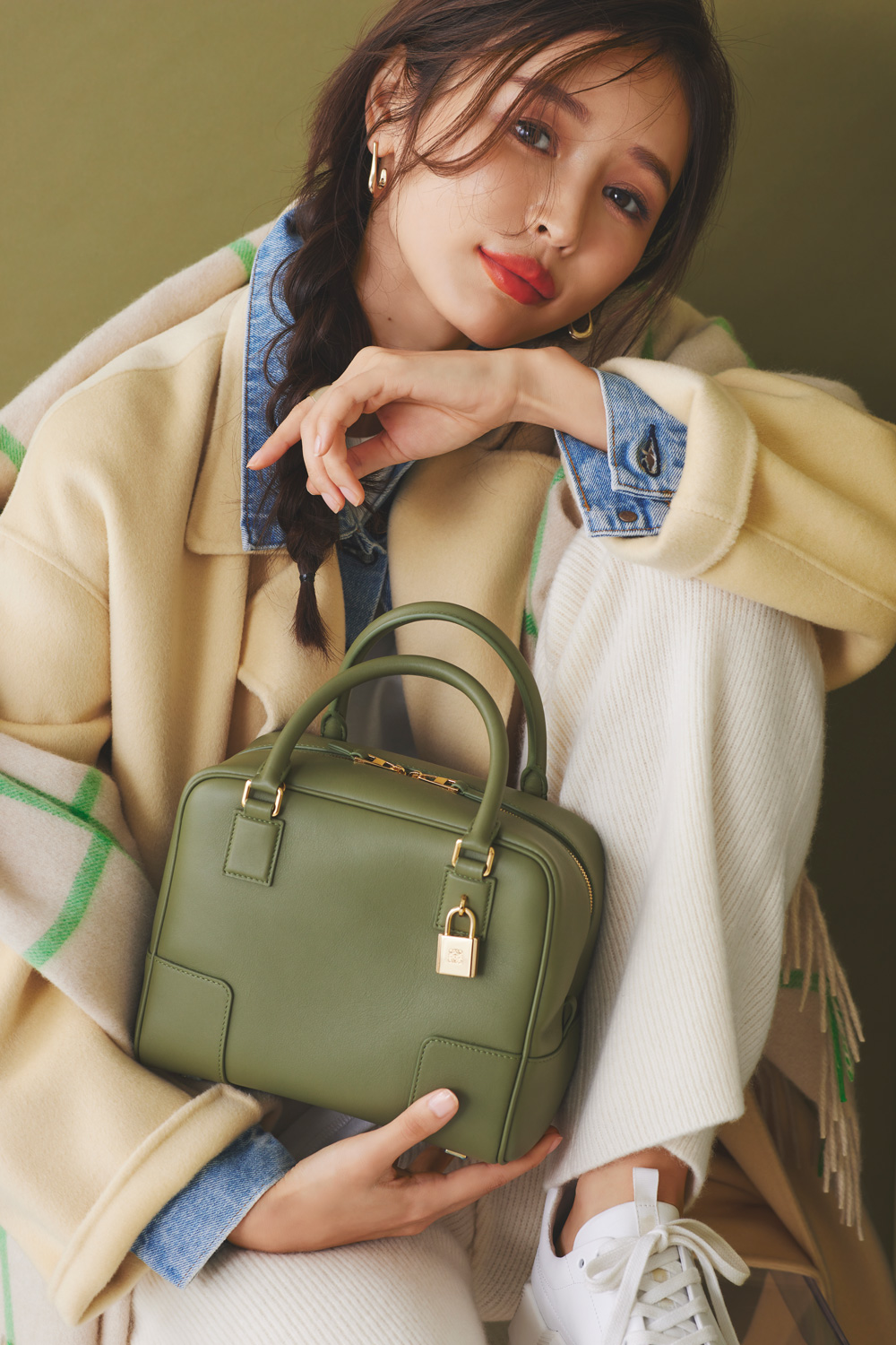 新生アマソナを手に取った感想を聞いてみると、「一見コンパクトだけど、しっかりマチのあるスクエアシルエットで、収納力が高いところもうれしい。ナパカーフレザーのやわらかい質感はロエベならではだし、カジュアルコーデに合わせても上質さが引き立つと思いました」と教えてくれたかぢちゃん。