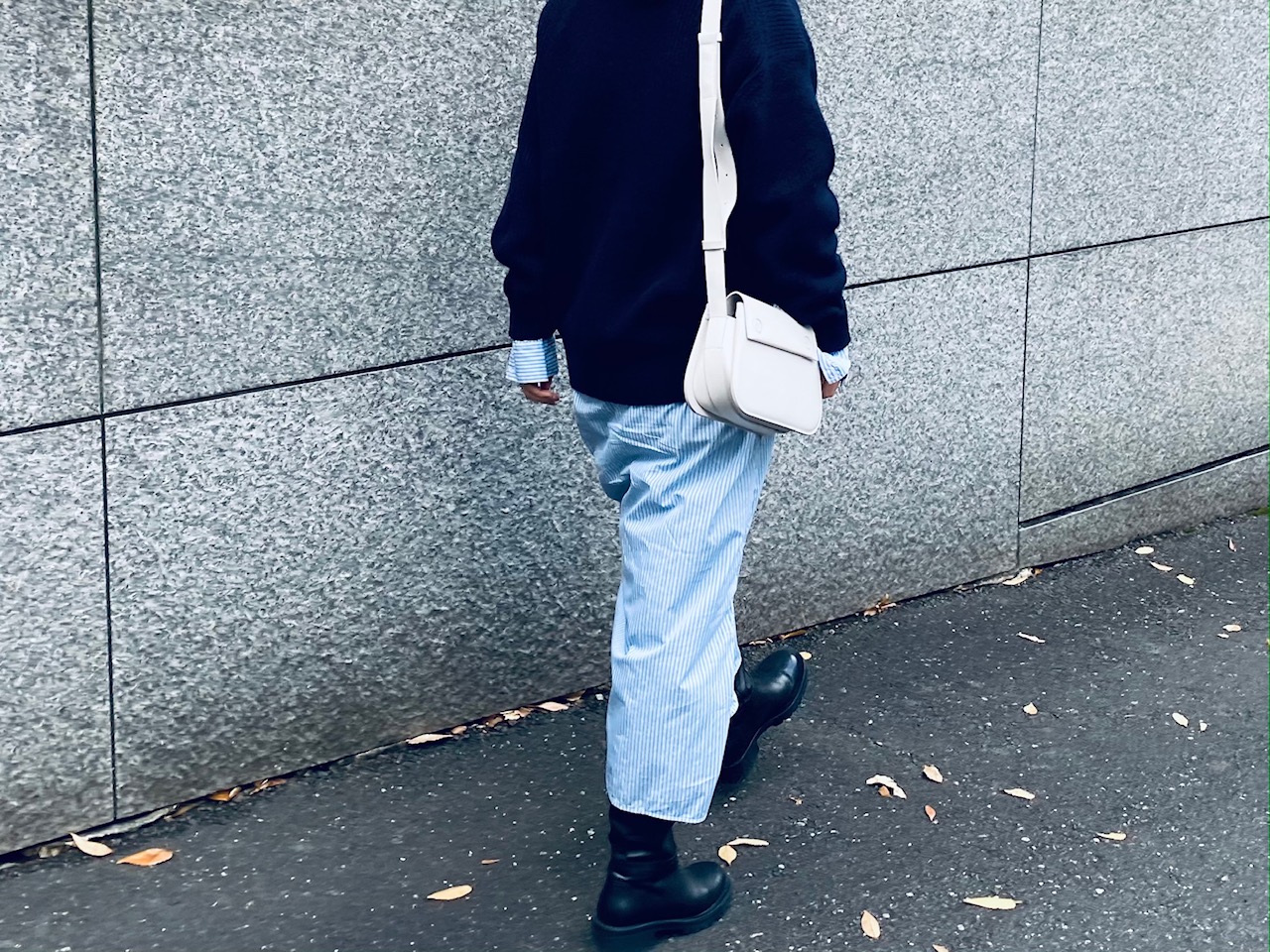 (スタイル抜群モデル鹿ちゃんの写真を、154㎝編集Kの私服で挟んで恐縮すぎるのですが)私も同じ配色をしてみました。白はバッグで差して、足元は黒いロングブーツ。空色のデニムもほしいなあと思いつつ、何度試着してもなんだか似合わないので(身長のせいか体型のせいか、はたまた雰囲気か)こんなかんじに。
