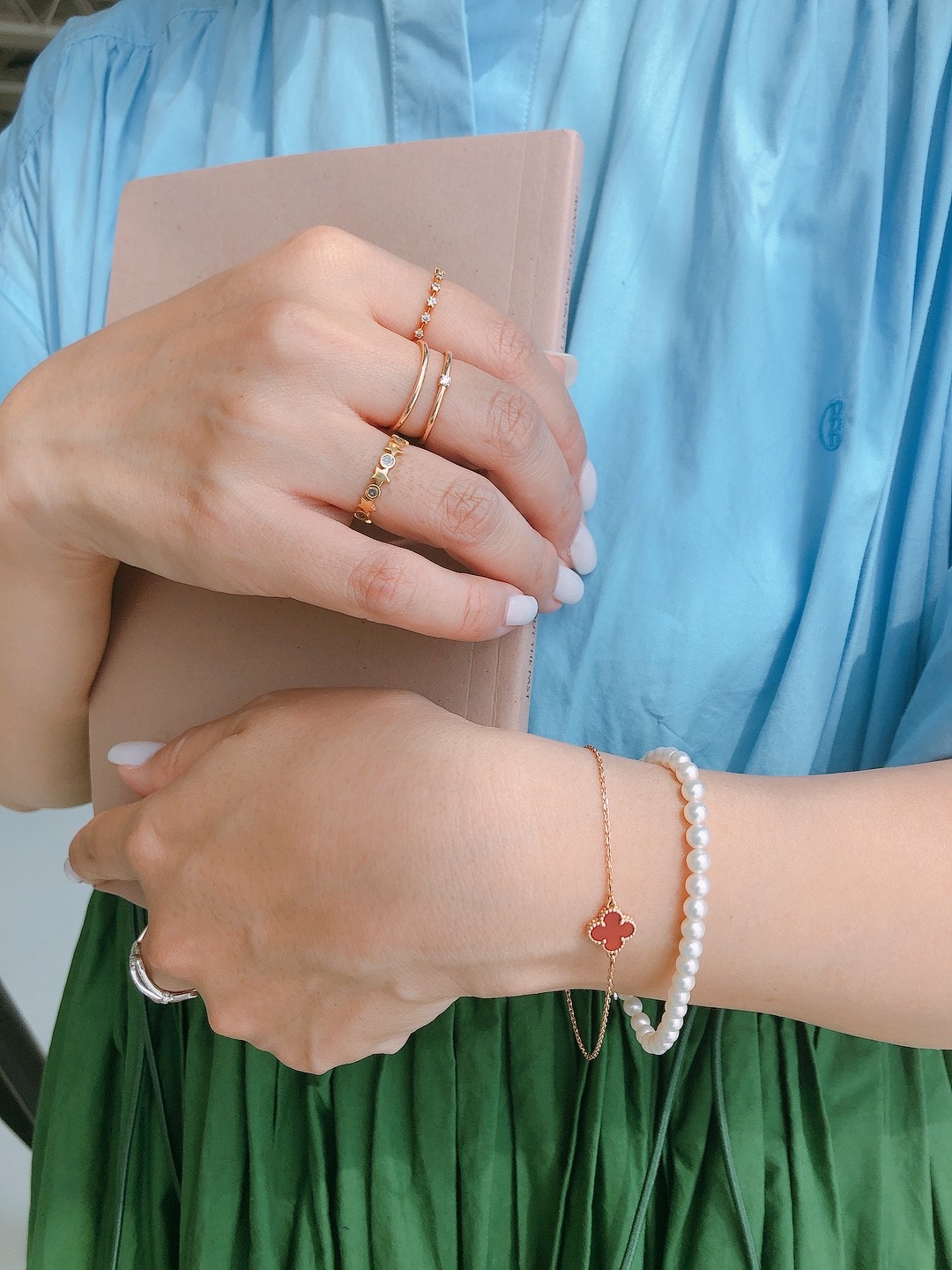 「モチーフものが好きでどんどん集まってきてしまうので、シンプルなデザインのものも意識して取り入れるようにしています。リングはいくつもレイヤードするのが好きなのですが気が付くと『いつものメンバーだな』となってしまうので、毎日変えるのがルール。その日のコーディネートに合わせて選んで重ねていくのも楽しい時間です」