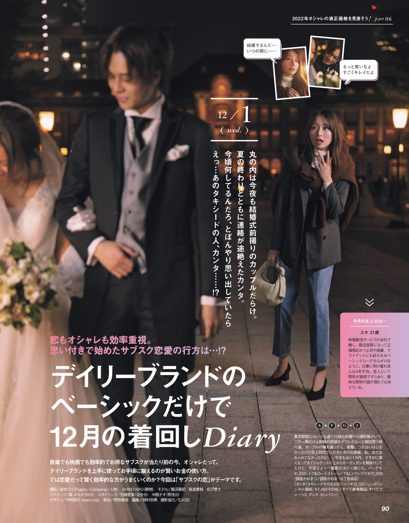 前回、大好評だったホテル暮らし女子の着回しDiary。今月も恋に傷ついた主人公が主役ですが、今回の主役はさらにアグレッシブ。男性にみずから「サブスク恋愛」を提案します…。恋愛がサブスクって…?気になった方はぜひ本誌をご覧ください。そして、着回したアイテムはユニクロやGapなど、お手頃アイテムのみ。プチプラでもこれだけオシャレに着回しできるということもご注目ください。