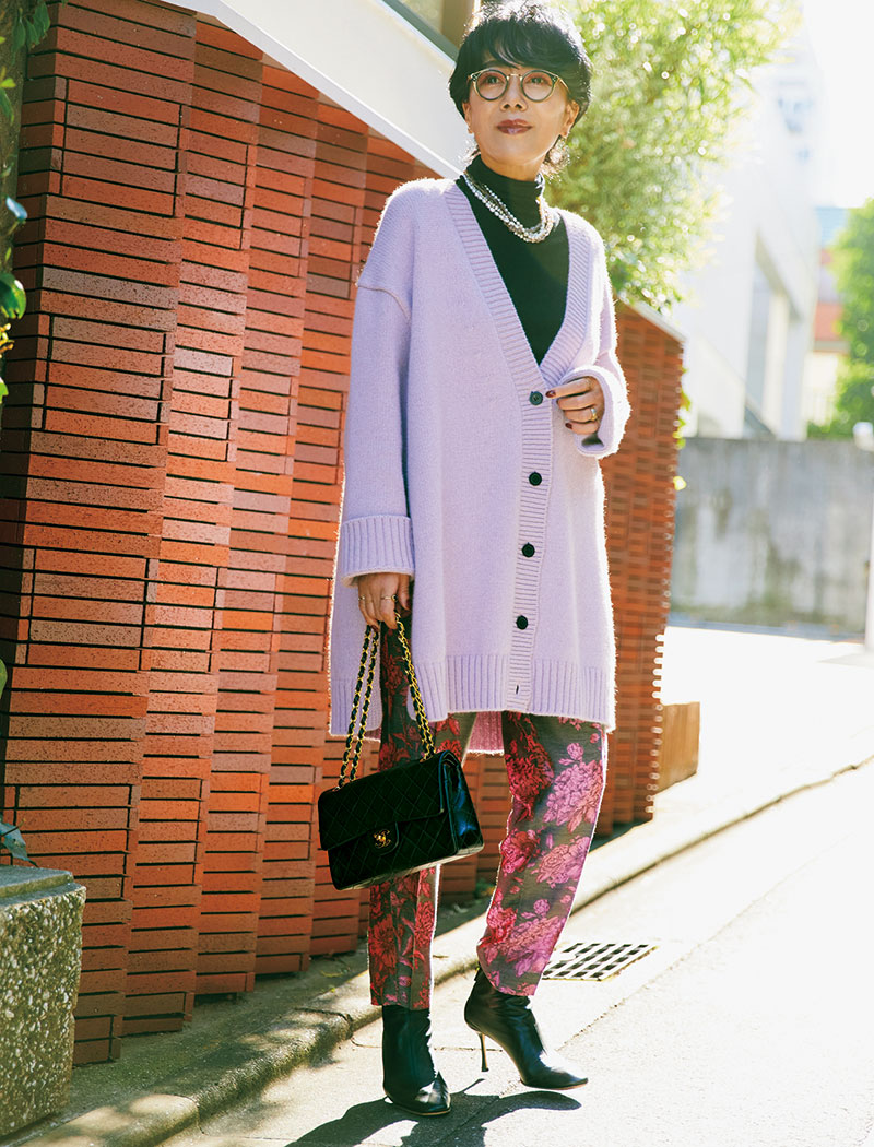 また、色ものやパーティスタイルについて相談されることも多いのですが、私がよく提案するのは、色ものは思い切ってワントーンで着こなすこと。そのほうがカッコいいし、派手色だけ浮かないのでかえって目立たないんです。オケージョンの日は無理に気張らず、普段も着られるドレスにキャッチーな小物を合わせるなど、遊び心の効いた着こなしが大人の余裕を感じられて素敵だと思います。