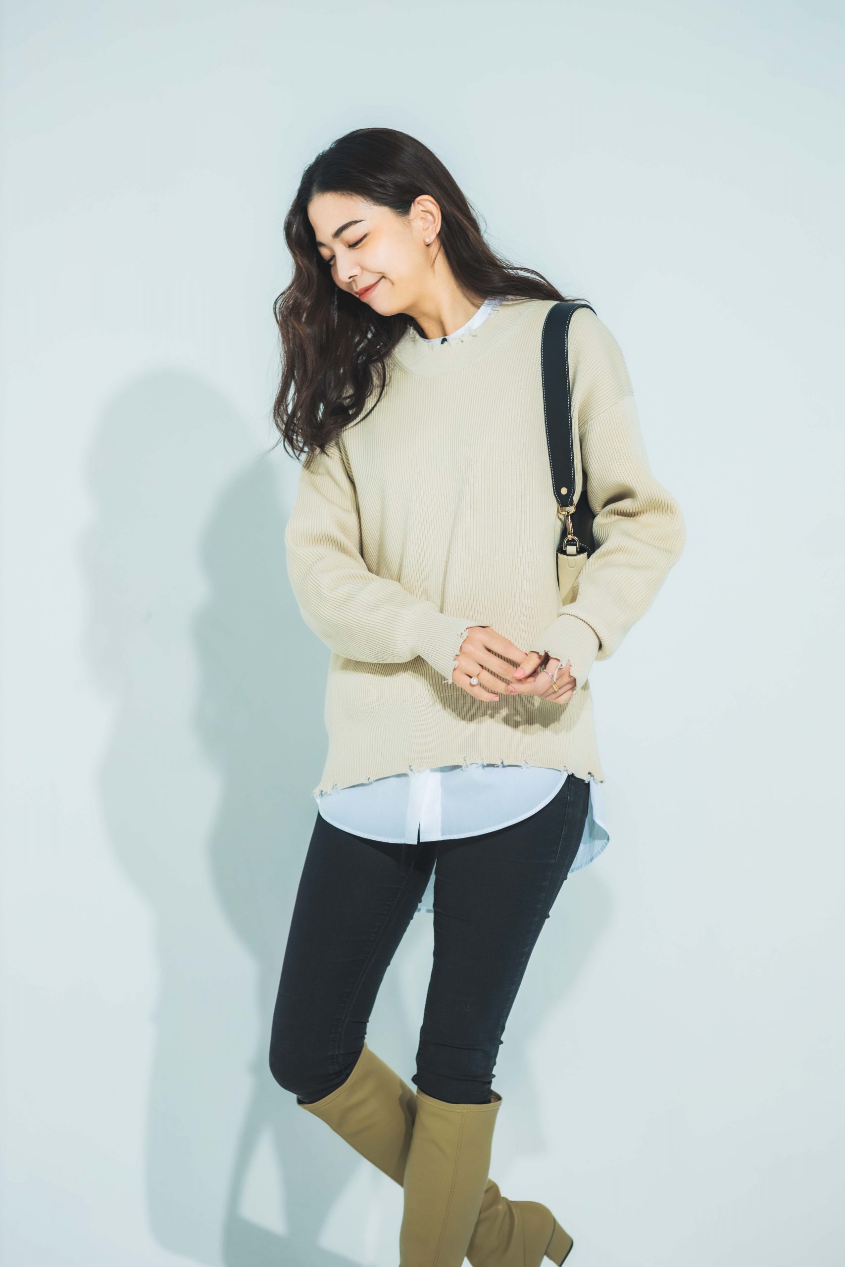 「今シーズンはどこかエレガントだったり、クリーンな着こなしがトレンド。とはいえ、どうしてもカジュアル要素は欠かせないと思うので、きれいめとカジュアルの割合が“8:2”くらいの“ほどよいきれいめ”が目標。具体的にはカジュアルアイテムであるデニムは履くけれど、ダメージ入りのブルーではなく、ノーダメージのブラックに変える。カジュアル感が強まるスニーカーは避けて、きれいめのブーツにチェンジすると今っぽくまとまります。ブーツも黒や茶ではなく、トレンドのベージュを選ぶことで抜け感が出ますよ」