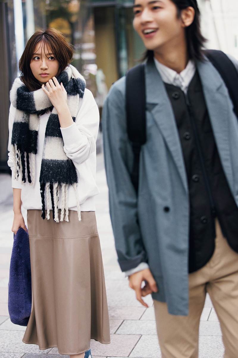 よく誘ってくれるのは嬉しいけど、どういうつもりなんだろ。私のことどう思ってる? だなんて聞けるはずもなく、お茶だけして帰っていった。ラフなスエットはスカートと柄ストールで女性らしく盛り上げて。ストール¥5,990(バナナ・リパブリック)バッグ¥6,990(ザラ/ザラ カスタマーサービス)[ヒロ君] ジャケット¥39,600シャツ¥17,600(ともにスティルバイ ハンド/スタイルデパートメント)インナーベスト¥35,200(ノービット)パンツ¥18,700(サンディニスタ/トゥー・ステップ)バックパック¥9,900(Oregonian Outfitters/JALUXSTYLE)