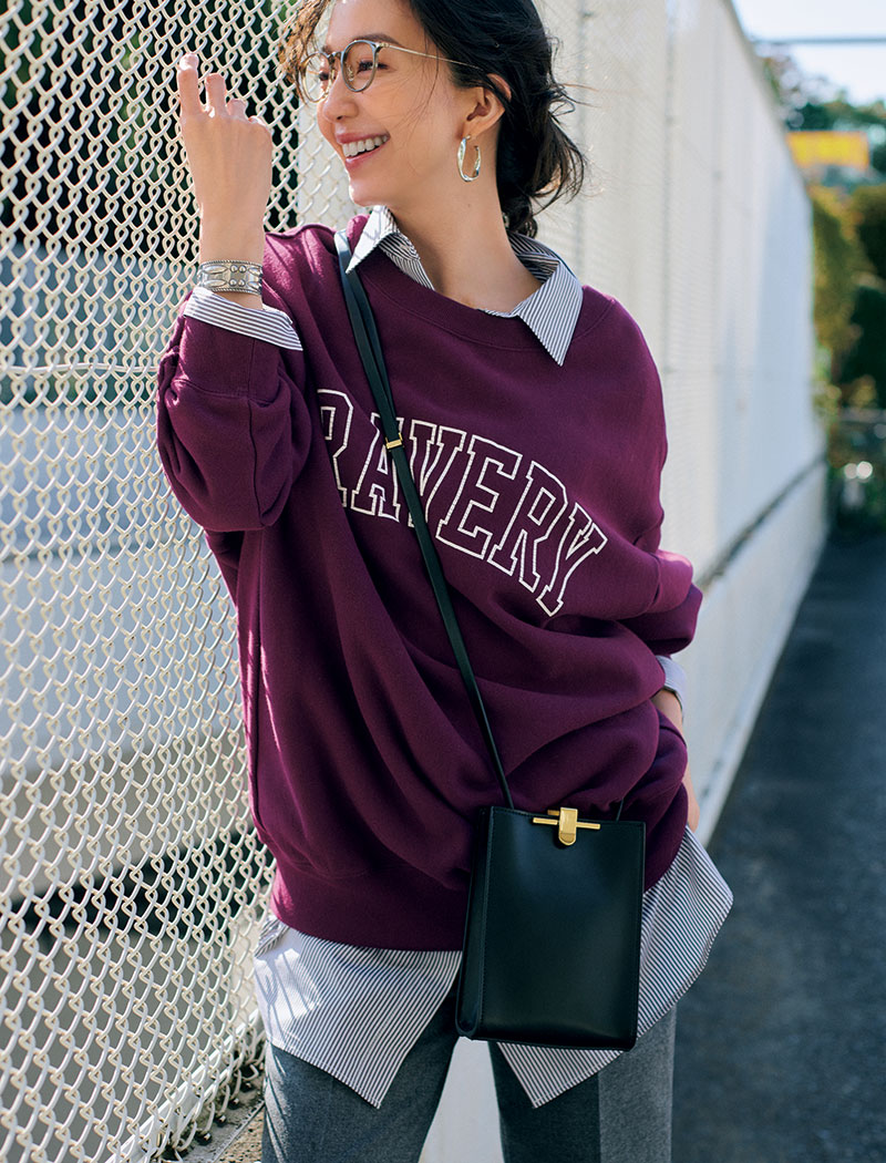 絶妙なオーバーシルエットが女っぽく着られる秘訣。スウェット¥12,100 (スピック&スパン/スピック&スパン ルミネ有楽町店)シャツ¥17,600(アルページュストーリー/アルページュストーリープレスルーム)パンツ¥22,000(プラージュ/プラージュ代官山店)バッグ¥63,800(ザンケッティ/エリオポール代官山)めがね¥38,500(アイヴァン7285/アイヴァン7285トウキョウ)ピアス¥11,000 (パズコレクティブ/ZUTTOHOLIC)バングル¥41,250(ノースワークス/UTS PR)