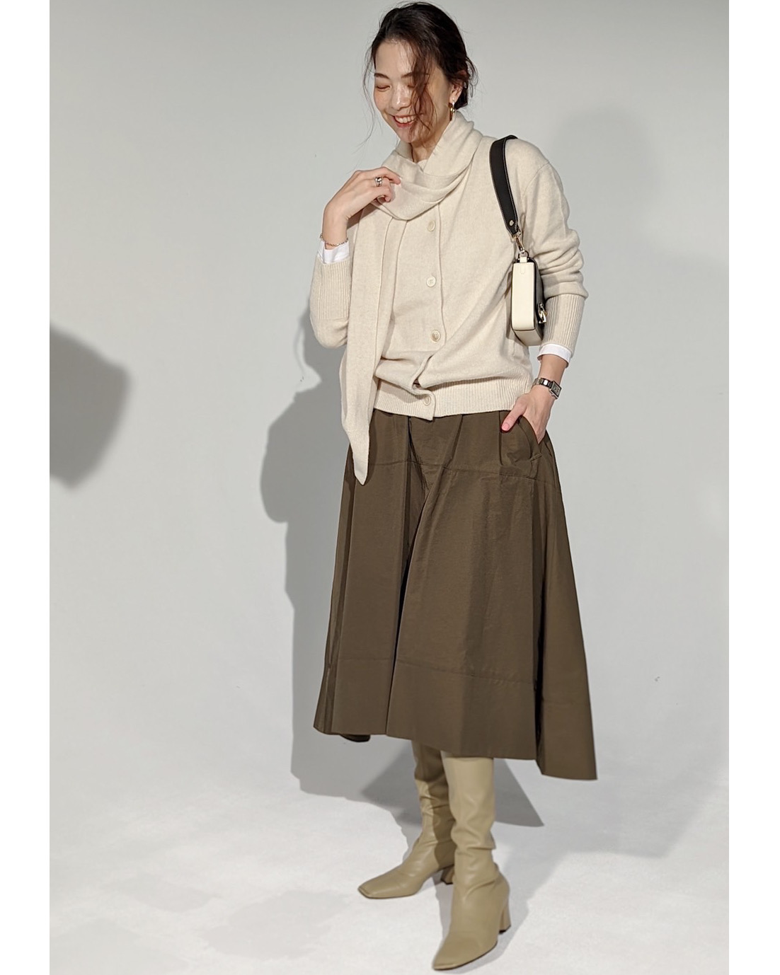「ニットとロングブーツの色味を合わせて、すっきりと。スカートコーデは極力スタイリッシュに見せたいため、トレンドの筒太ブーツよりタイトなデザインの方が好みです」(佐藤さん)