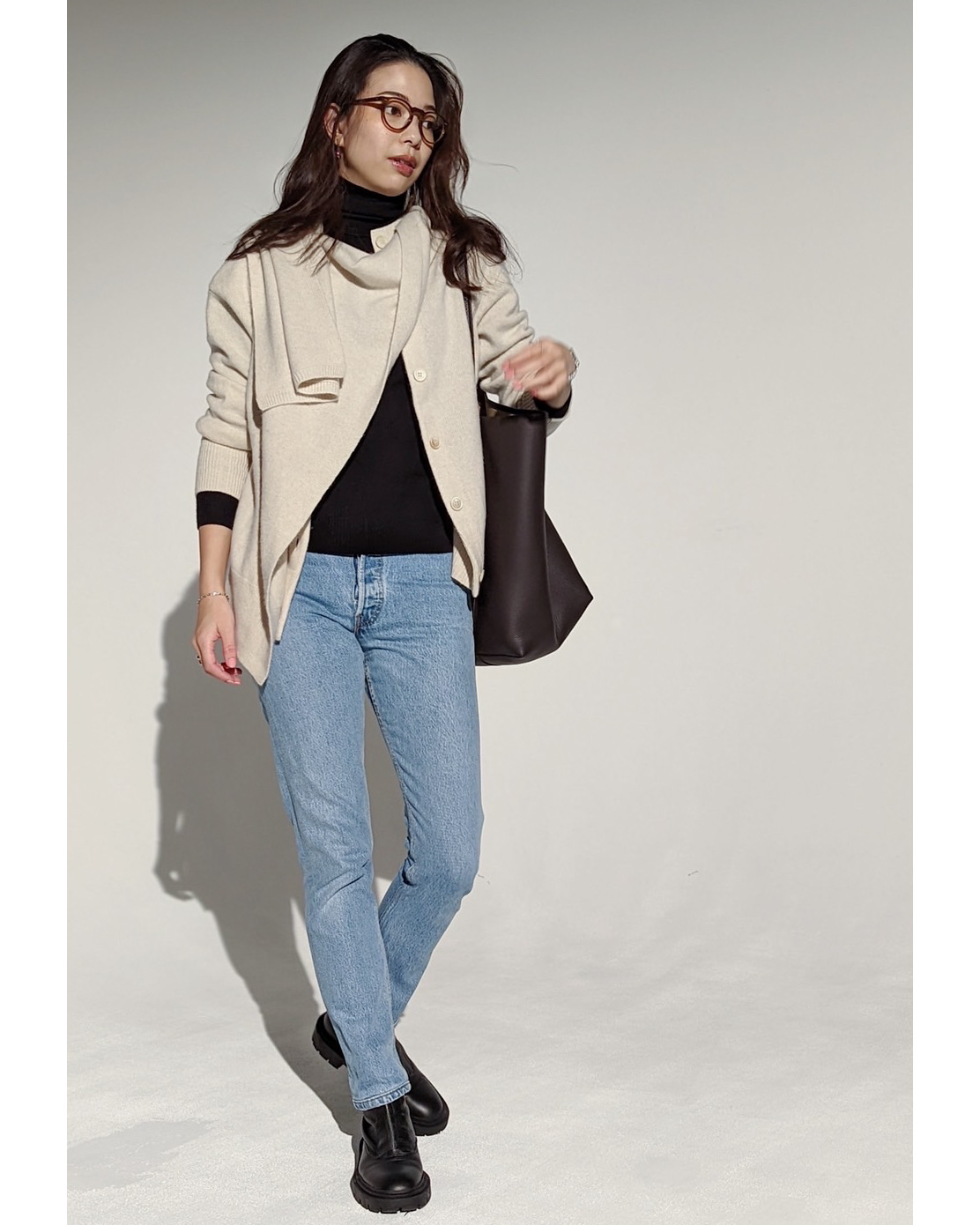 「ニットのボタンを全部開けて、カーディガンとして着用しました。ストレートデニムと合わせるときは、髪を下ろしたり、ストールをふんわり巻いたりと、上半身にボリュームを出すのがスタイルアップの秘訣」(佐藤さん)