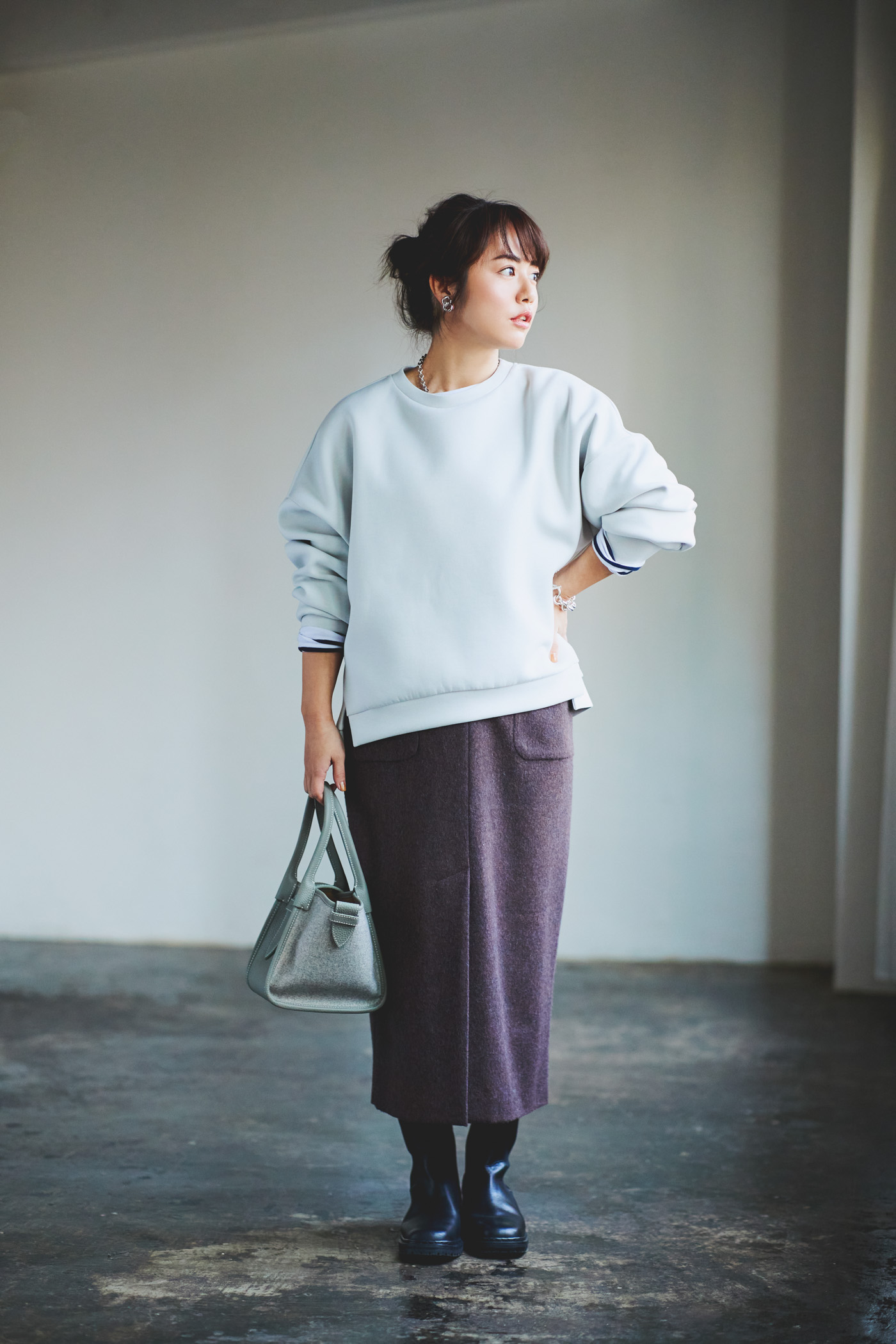 タイトスカート¥16,500(PUBLIC TOKYO/PUBLIC TOKYO 神宮前店)スエットプルオーバー¥9,900(ステートオブマインド/ゲストリスト)ボーダーカットソー¥2,990(Gap/Gap新宿フラッグス店)バッグ¥40,700(ヴァジック/バーニーズ ニューヨーク カスタマーセンター)ブーツ¥64,900(PIPPICHIC/ベイジュ)イヤリング¥7,350(アビステ)ネックレス¥74,800(マリハ)ブレスレット¥36,960(パズコレクティブ/ZUTTOHOLIC)