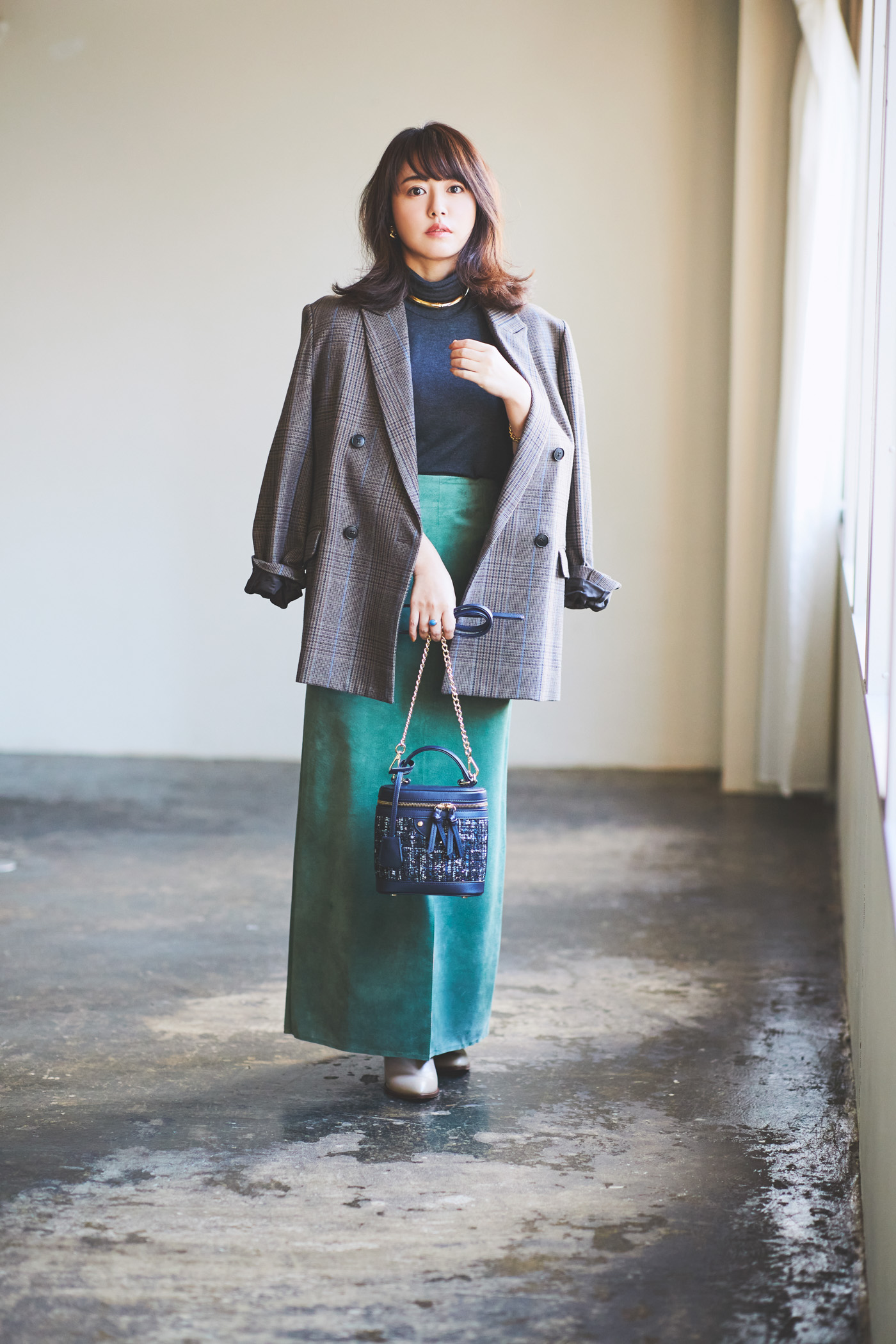 タイトスカート¥64,900(ブルーバード ブルバード)ジャケット¥29,700(アンクレイヴ)タートルネックカットソー¥13,200(ラ・エフ)バッグ¥14,300(ダイアナ/ダイアナ 銀座本店)ブーツ¥39,600(ペレテルノ/エテルノ)タイツ¥1,430(タビオ/Tabio)イヤリング¥16,200(アビステ)チョーカー¥14,850ブレスレット¥8,800(ともにイン ムード/フォーティーン ショールーム)リング¥189,200(マリハ)