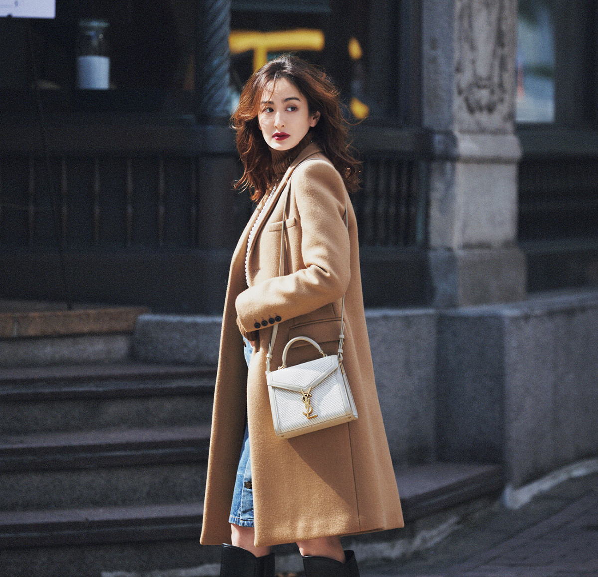 キャンバス×レザーの組合せでナチュラルなベージュをリッチに仕上げたベイビーカサンドラ。コートの色と合わせてワントーンに。バッグ「ベイビー・カサンドラ」〈H16×W20×D7.5㎝〉[ショルダーストラップ取り外し可能]¥302,500コート¥561,000ニット¥126,500スカート¥126,500ロングブーツ¥220,000ネックレス¥121,000(すべてサンローラン バイ アンソニー・ヴァカレロ/サンローラン クライアントサービス)