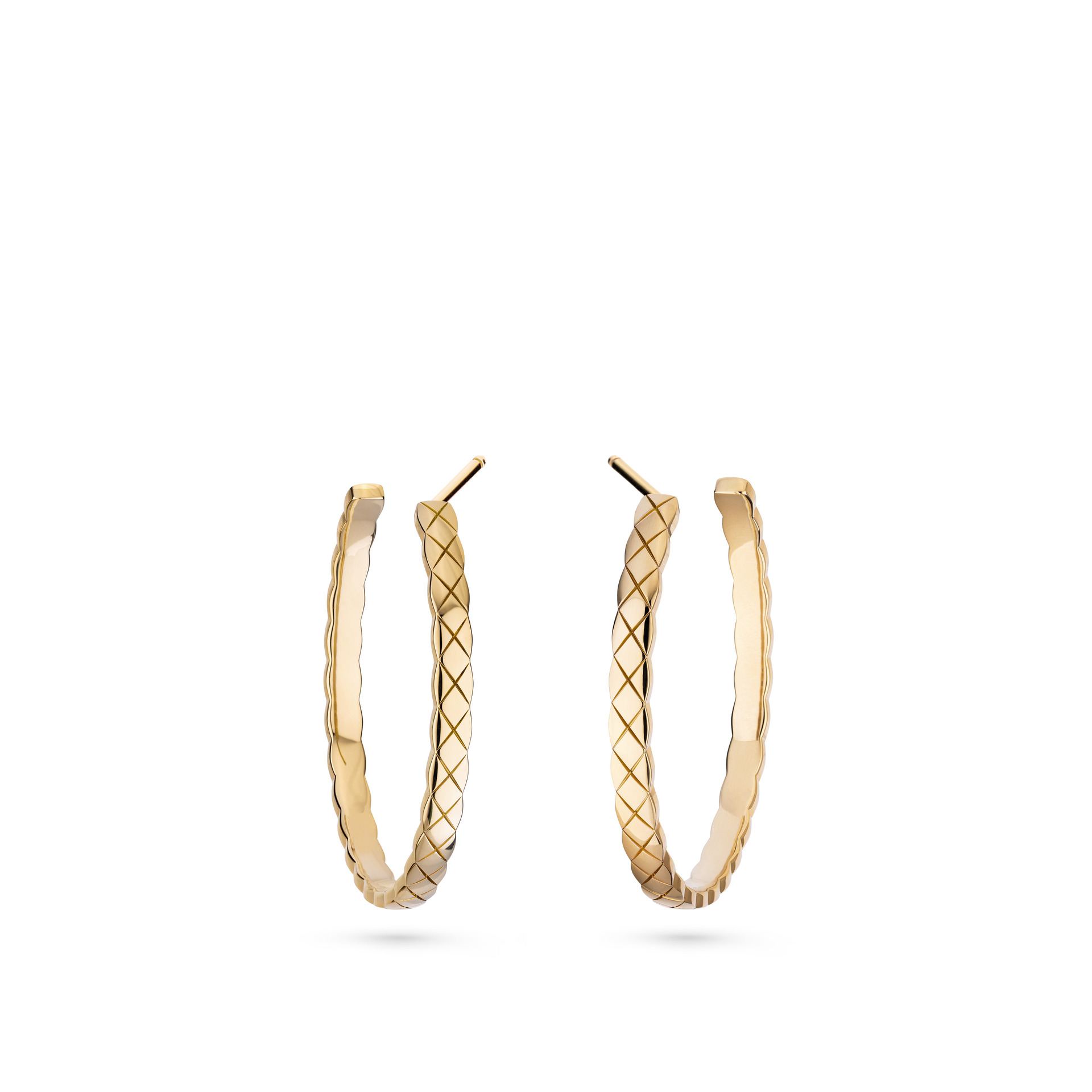 “C”の文字を象ったフープイヤリングは、フェイスラインに添うように調整されたポストの角度がキーポイント。径36㎜のフープは存在感がありつつも、顔まわりのシルエットにすんなりフィット。洗練された華やかさをもたらしてくれます。ミニマルなイエローゴールド、ベージュゴールドに加え、ホワイトゴールドではダイヤモンドのアクセントも!