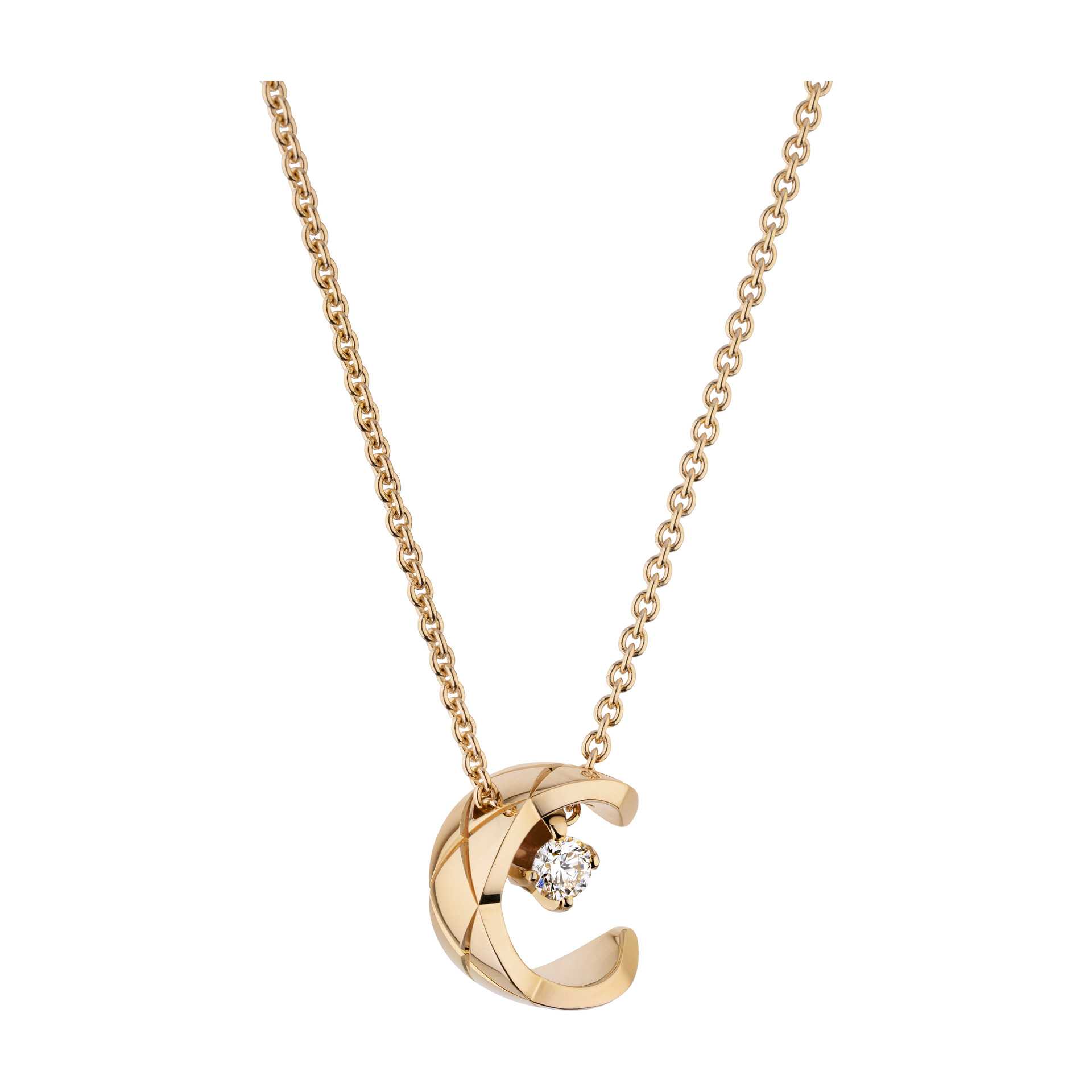シャネルのアイコニックな“キルティング”をモチーフにしたファイン ジュエリー「ココ クラッシュ」コレクション。キルティングのふっくらとした質感を表現したネックレスは、C字型のモチーフの中央にダイヤモンドがキラリ。上品で洗練されたデザインが、胸元を華やかに彩ってくれます。