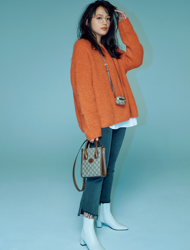ペアで楽しみたいミニバッグと、リモワ時代に必要なAirpodsケース。バッグ¥145,200Airpodsケース¥74,800(ともにグッチ/グッチジャパン)ニット¥23,100(ウィム ガゼット/ウィム ガゼット ルミネ新宿店)カットソー¥17,600(エイトン/エイトン青山)パンツ¥28,600(マザー/サザビーリーグ)靴¥27,500(ピシェ アバハウス/ピシェ アバハウス ルミネ有楽町店)眼鏡¥11,100(ゾフ/ゾフ カスタマーサポート)リング¥11,990(ドミニク ドゥネーブ/シップス有楽町店)