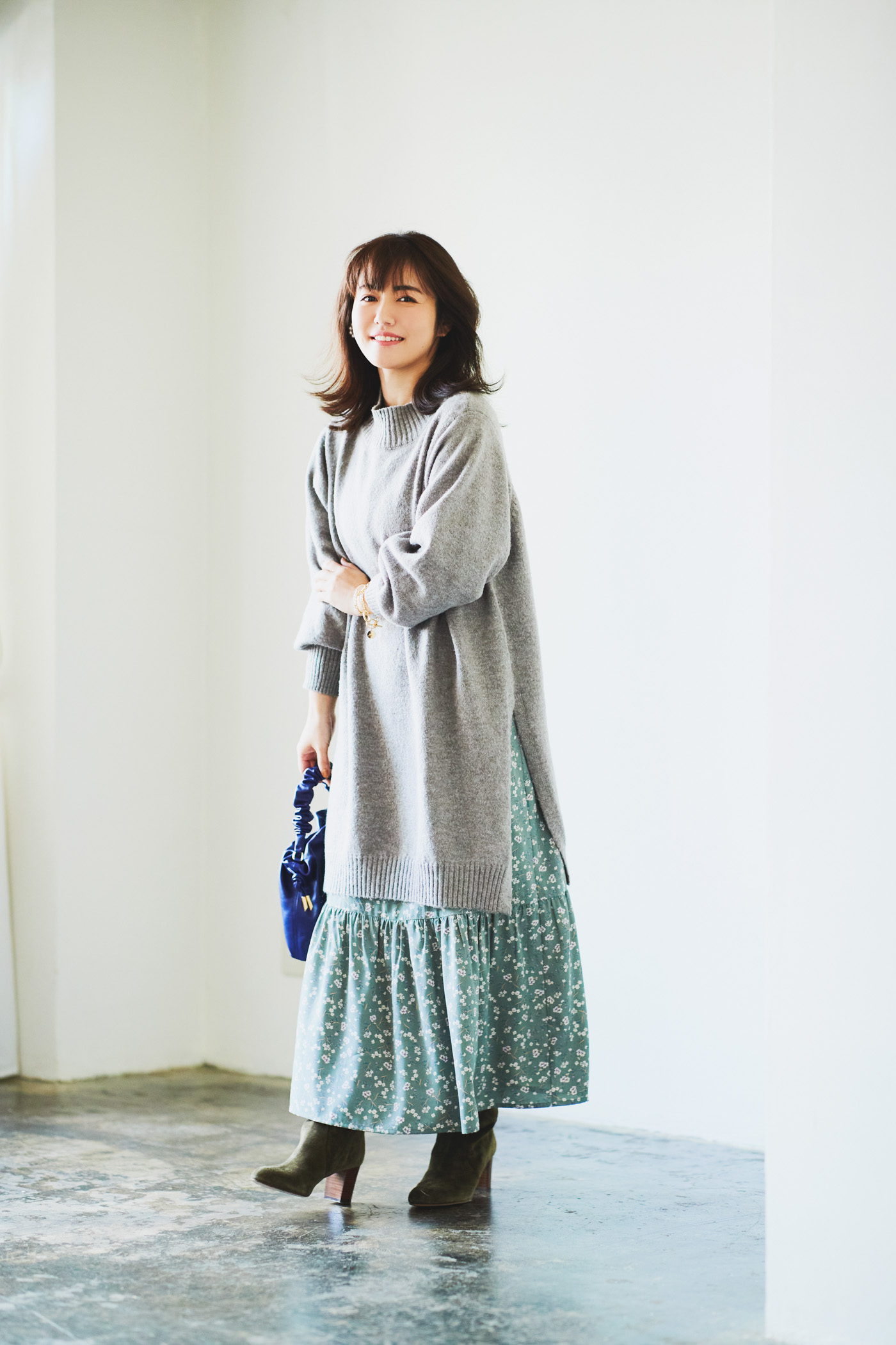 ふくよか体型の強い味方、ニットチュニックは両サイドに入れた深めのスリットが細見えのポイント!スリットの鋭角ラインがしゅっとした印象に見せてくれます。おすすめの着こなしは柄ワンピとのレイヤード。小花柄&寒色系なら甘すぎず、大人っぽい雰囲気で着られます。