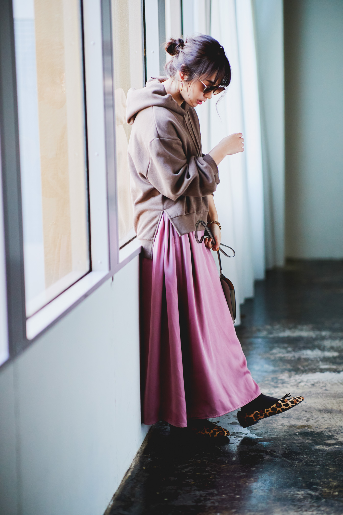 裏起毛フーディ¥6,600サテンマキシスカート¥7,700(ともにSTRIPE CLUB×磯山さやか/ストライプインターナショナルカスタマーサポート)バッグ¥27,500(ヴァジック/ヴァジックジャパン)バレエシューズ¥35,200(ファビオ ルスコーニ/ファビオ ルスコーニ ジェイアール名古屋タカシマヤ店)タイツ¥1,430(タビオ/Tabio)サングラス¥40,700(アイヴァン/アイヴァン 東京ギャラリー)ピアス¥283,800(ウノアエレ/ウノアエレ ジャパン)ブレスレット¥7,350(アビステ)リング¥240,900(マリハ)