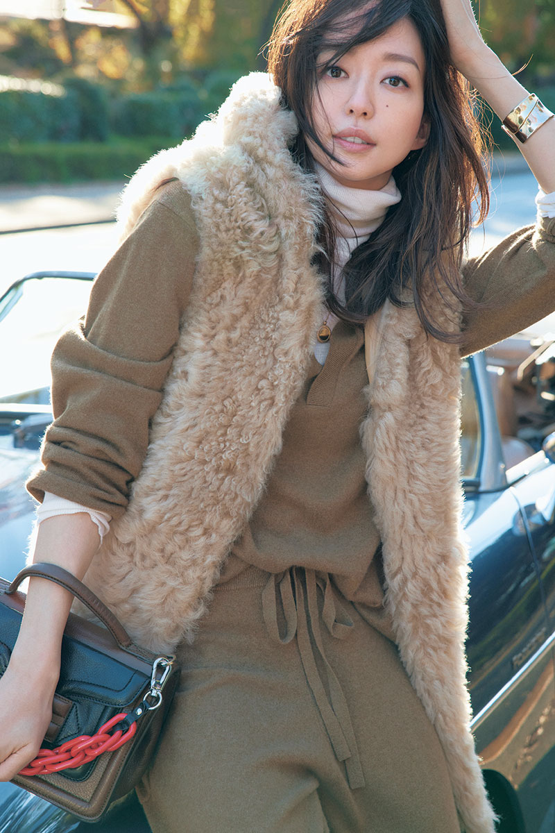 ニット¥47,300パンツ¥53,900(ともにアンスクリア/アマン)ファージレ¥154,000〈ジェッリ〉タートルニット¥14,300〈カレンソロジー〉(ともにカレンソロジー新宿)バッグ¥163,900スニーカー¥79,200(ともにピエールアルディ/ピエールアルディ東京)帽子¥7,700(スポーティアンドリッチ/アパルトモン青山店)サングラス¥52,800(アイヴァン7285/アイヴァン7285トウキョウ)ネックレス¥14,300(フィリップ・オーディベール/アルアバイル)バングル¥19,800(インムード/フォーティーン ショールーム)
