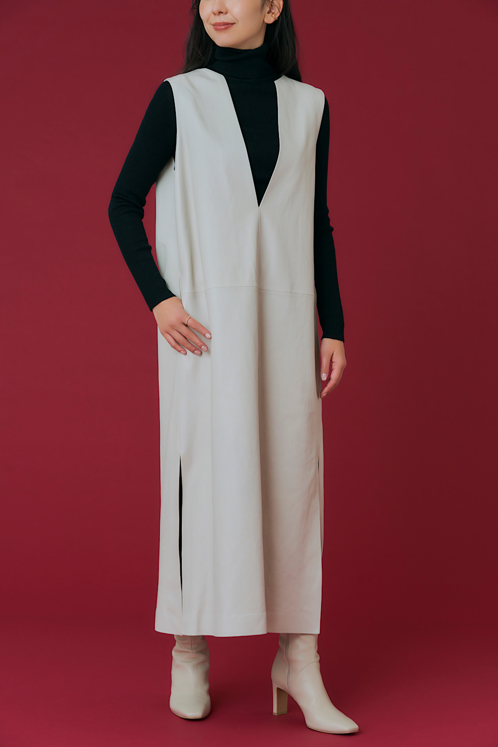 最近注目が集まっている、ボックスシルエットのV開きワンピース。キャミワンピースと同じ感覚で着られますが、胸元のVが深めなので、定番のタートルからブラウスまで、より幅広くレイヤードが可能です。サイドスリット入りなら、より軽やかかつ大人可愛く着られます。