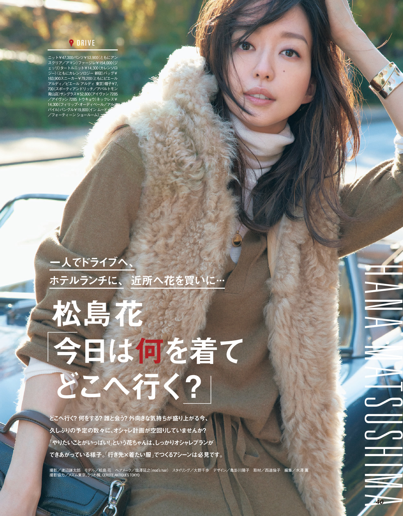 1月号からカバーモデルになった松島花さん。私服もオシャレで有名な彼女の、今年の冬、お出かけするなら何をする?どこへ行く?何を着ていく?をテーマにしたファッションページです。意外だったのは実は運転大好き!撮影のスタジオにもよく、めちゃくちゃカッコいいマイカーで登場しています。花ちゃんのライフスタイルも覗ける企画になっているのでぜひご覧ください。