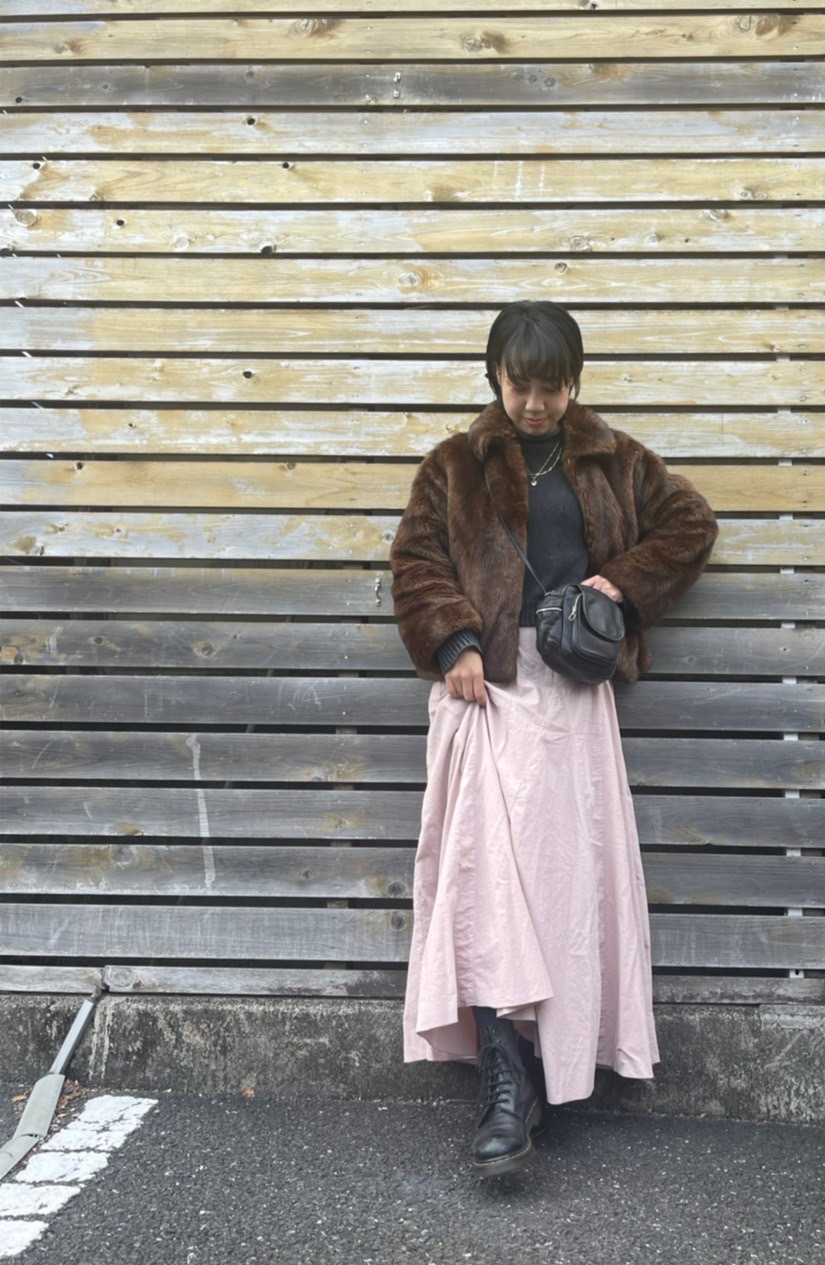 「大人でも挑戦しやすいピンクの色味に惹かれました。コーデュロイ素材といっても薄手なので、真夏以外は使える万能スカート。ボリュームシルエットだけど、低身長の私にもハマります。黒のブーツやバッグ、ギラっとしすぎるかもしれないゴールドのアクセも、主張しすぎないピンクのお陰でハードになり過ぎずにまとまりました」(スタイリスト 村瀬萌子さん)