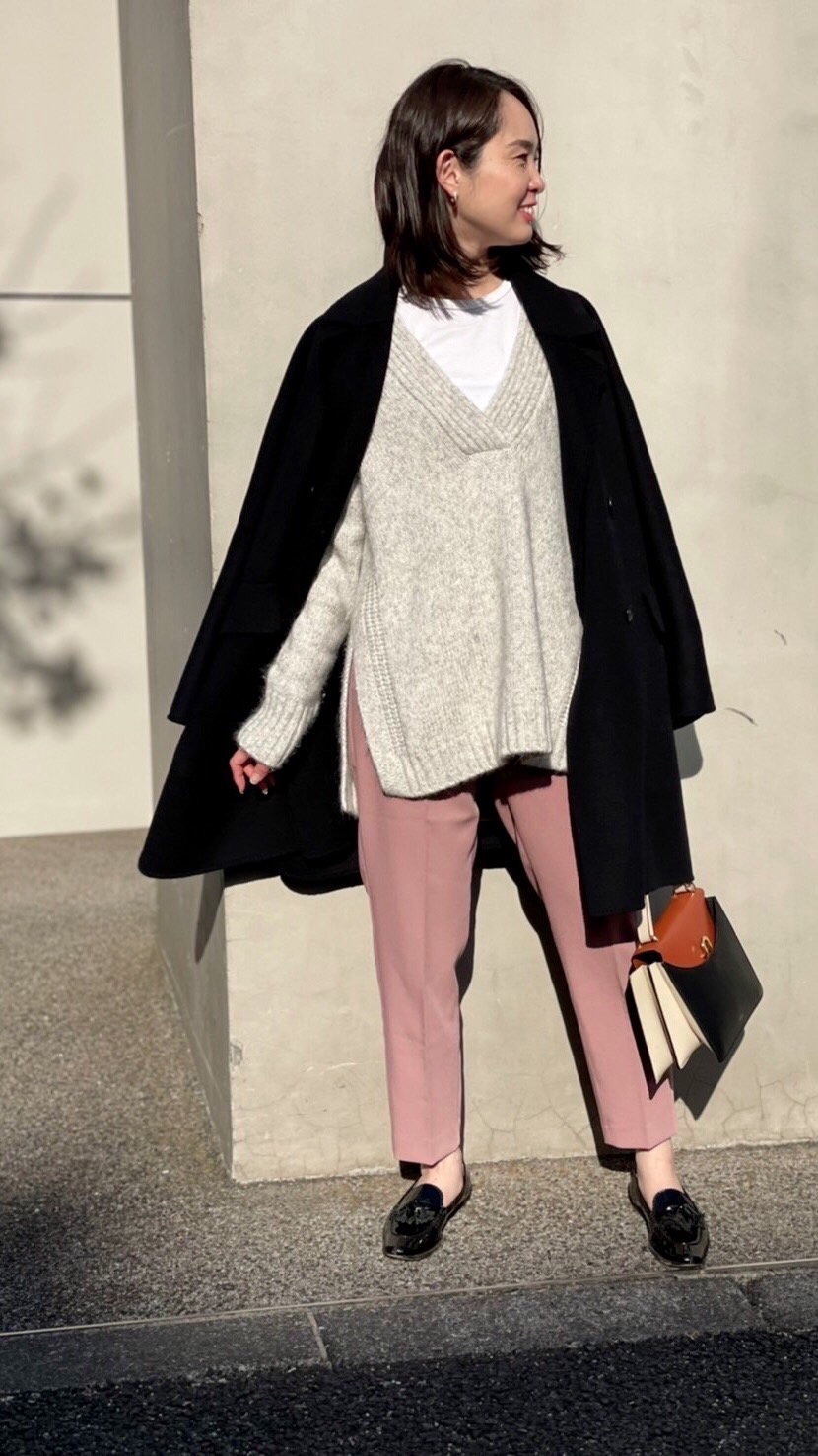 「くすみピンクでコーディネートしやすそうなのと、立体感あるシルエットで着こなしが単調にならなそうだと思い購入しました。色数が多いと子どもっぽくなりそうなので、ピンクを着る日は極力コーデに使う色数を少なくするのがマイルール。淡いピンクは黒を合わせてもコントラストがつき過ぎないので、コートもトップスも足元も黒で統一してすっきり見せました」(ライター 坂本結香さん)