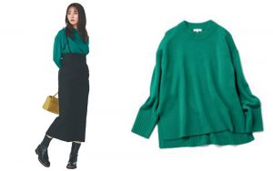 ゆったりニットは、今季トレンドど真ん中の濃いめグリーンを狙えば間違いありません。¥9,990(PLST)