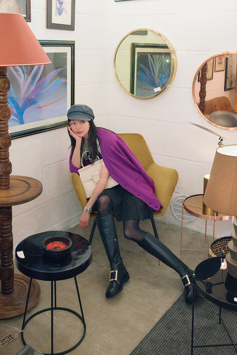 ニット¥47,300パンツ¥53,900(ともにアンスクリア/アマン)ファージレ¥154,000〈ジェッリ〉タートルニット¥14,300〈カレンソロジー〉(ともにカレンソロジー新宿)バッグ¥163,900スニーカー¥79,200(ともにピエールアルディ/ピエールアルディ東京)帽子¥7,700(スポーティアンドリッチ/アパルトモン青山店)サングラス¥52,800(アイヴァン7285/アイヴァン7285トウキョウ)ネックレス¥14,300(フィリップ・オーディベール/アルアバイル)バングル¥19,800(インムード/フォーティーン ショールーム)