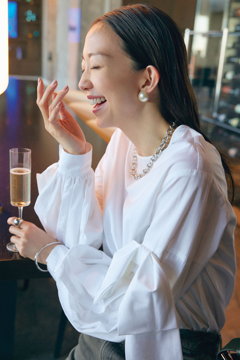 ナイトシーンに映えるデザインスリーブの白ブラウス。裾をギュッとデニムに押し込めば、程よくエッジな女らしさが際立ちます。なでつけたヘアスタイルもアクセントに。ブラウス¥36,300(EVA MANN/THIRD MAGAZINE)デニムパンツ¥20,900(レッドカード/ゲストリスト)ピアス¥5,940(アビステ)ネックレス¥9,900バングル¥6,330(ともにエイチアッシュ/フォーティーン ショールーム)リング¥33,000(ルフェール/UTS PR)