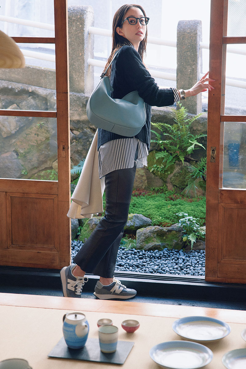 コート¥39,930(アンクレイヴ)ニット¥26,400(ポロ ラルフ ローレン/ラルフ ローレン)シャツ¥28,600(コキュカ/ザ ストア バイシー 代官山店)パンツ¥181,500(マディソンブルー)バッグ¥70,400(コーチ/コーチ・カスタマーサービス・ジャパン)スニーカー¥10,340(ニューバランス/ニューバランス ジャパンお客様相談室)メガネ¥29,700(アイヴァン/アイヴァン 東京ギャラリー)ネックレス¥17,280(アビステ)バングル¥20,900リング¥15,400(ともにアンセム フォー ザ センセズ/アマン)