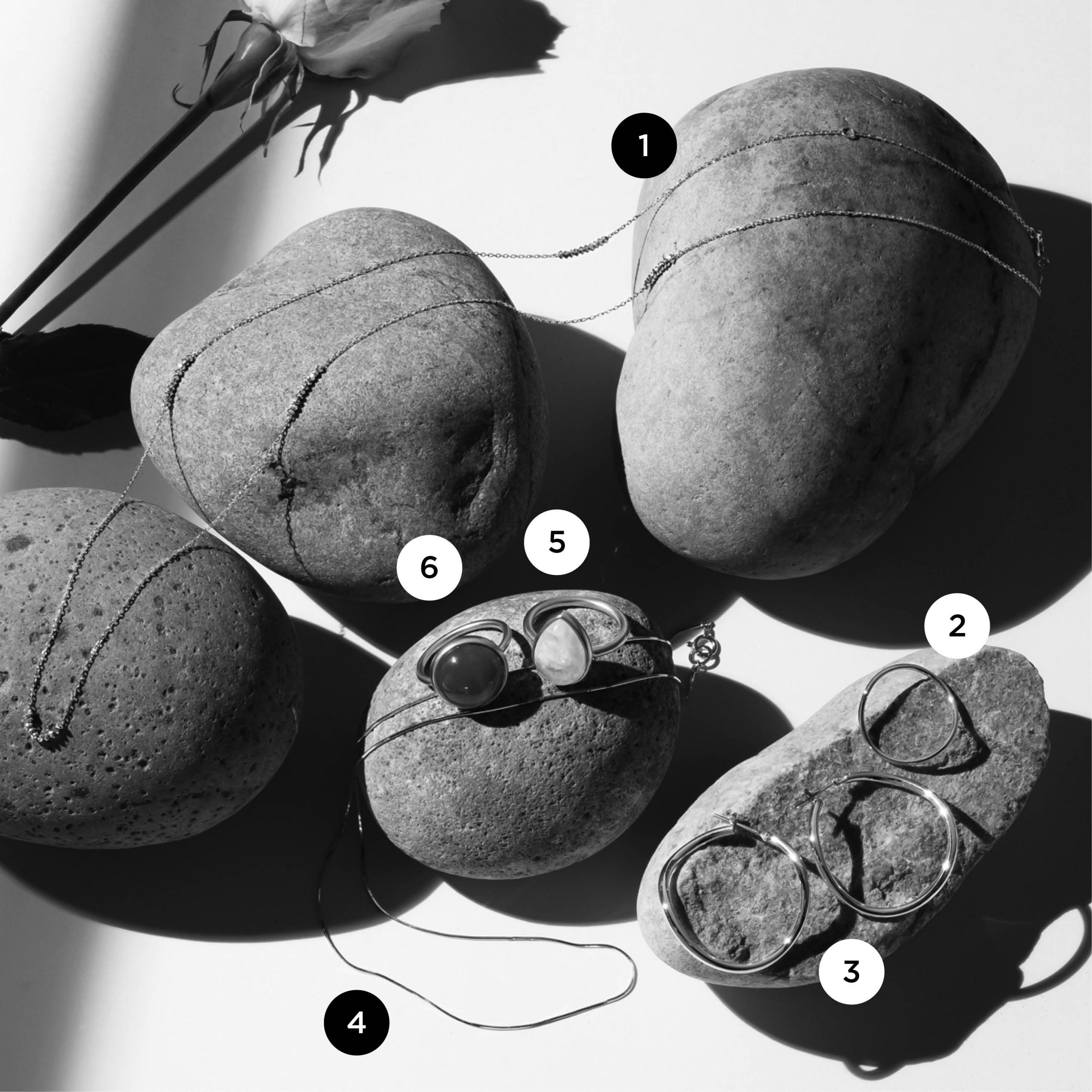 1.「時の砂 ネックレス ステーション 60cm」<K18YG>¥77,000 2.「願い事ウェーブ リング」<K18YG>¥45,100 3.「願い事ウェーブ フープピアス(M)」<K18YG>¥88,000 4.「Serpentine ネックレス 45cm」<K18YG>¥104,500 5.「Earth Drops リング(レインボームーン)」<K18YG>¥231,000 6.「Earth Drops リング(グレームーン)」<K18YG>¥172,700 (すべてマリハ/マリハインターナショナル)