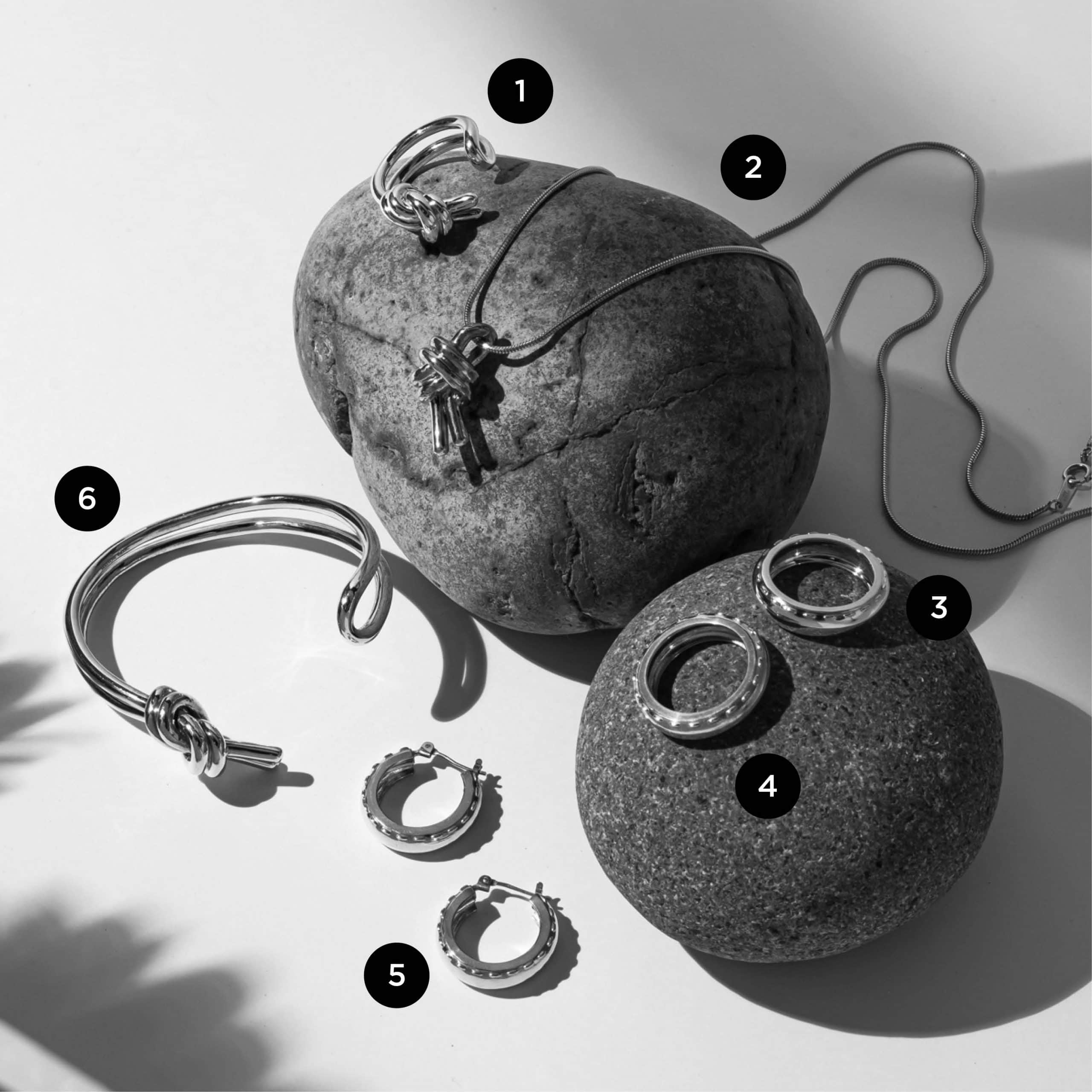 1.「Knot Ring」<SV925>¥30,800 2.「Knot Necklace 60cm」<ブラス+K18GP>¥34,100 3.「Cord Narrow Ring」<SV925>¥24,200 4.「Cord Narrow Ring」<ブラス+K18GP>¥24,200 5.「Cord Narrow Hoop Earrings」<ブラス+K18GP>¥34,100 6.「Knot Small Bracelet」<ブラス+K18GP>¥55,000 (すべてメゾンヴァジック/ヴァジックジャパン)