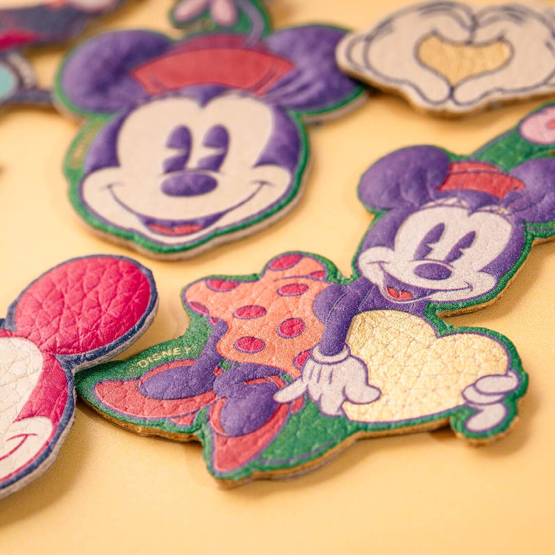 このセットは限定のパッケージで、引き出し型のボックスに、レザー小物が2点入った仕様。また立体感のあるエンボスレザーを使用したメゾン ド サブレのオリジナルレザーステッカーがセットに含まれています。高級感のあるメタリックゴールドをあしらったステッカーはミッキー&ミニーまたはクマのプーさんから好きな方を選ぶことができます。