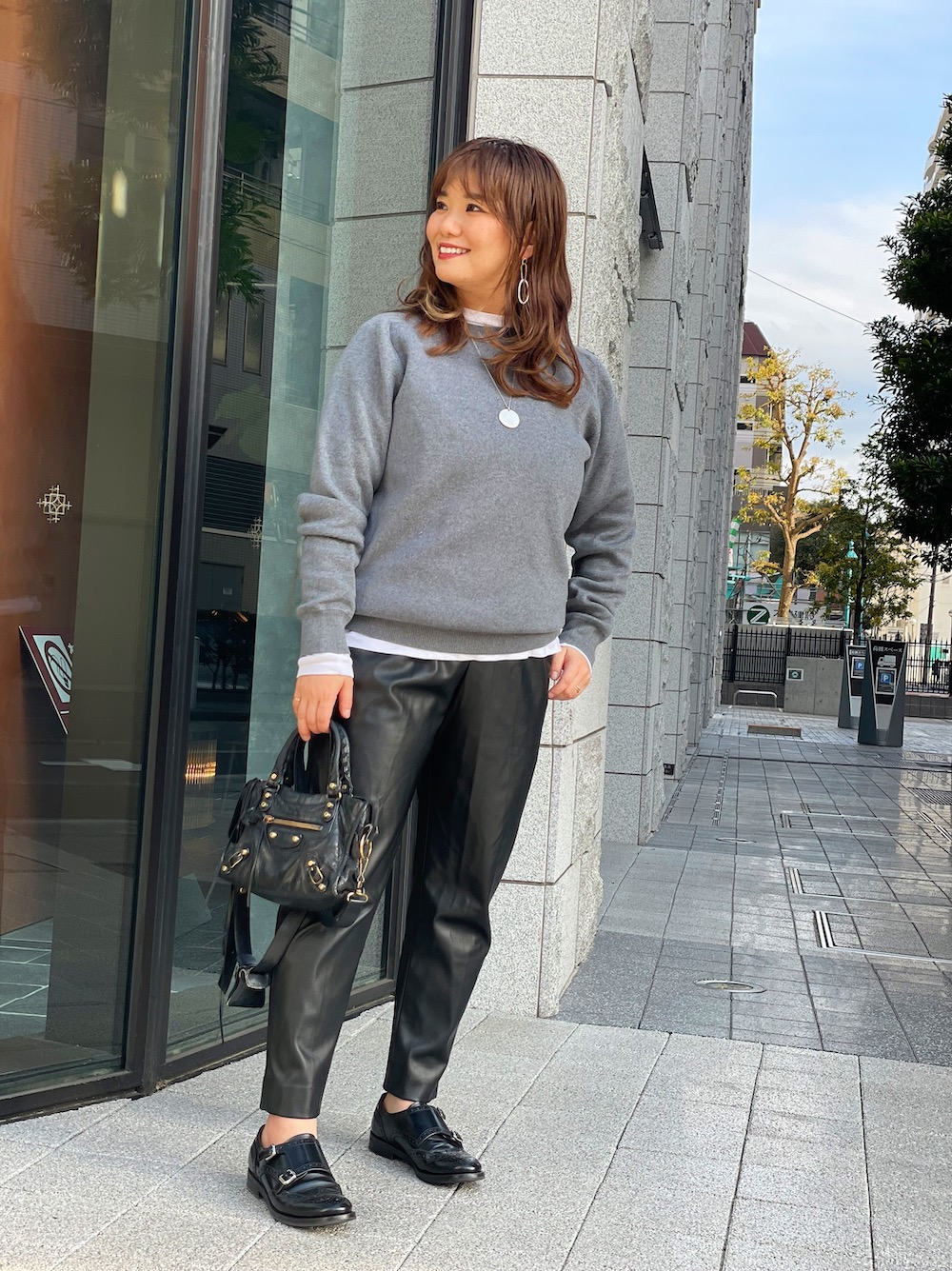 「辛口でボリューム感のあるおじ靴は、ぽっちゃりさんの救世主!靴に合わせてお洋服もちょっとカッコよくまとめると細見えすると信じています……だって、甘いよりも辛いほうがスリムに見えそうじゃありませんか!? という持論で、ハードめなレザーパンツを投入してシュッっと引き締め。スローンのこのニットはぽっちゃりさんでも身体のラインが出すぎず、スウェットみたいな生地で春先も涼しげに着られます。仕上げにインナーのTシャツを挟んで、アクセントを加えました」