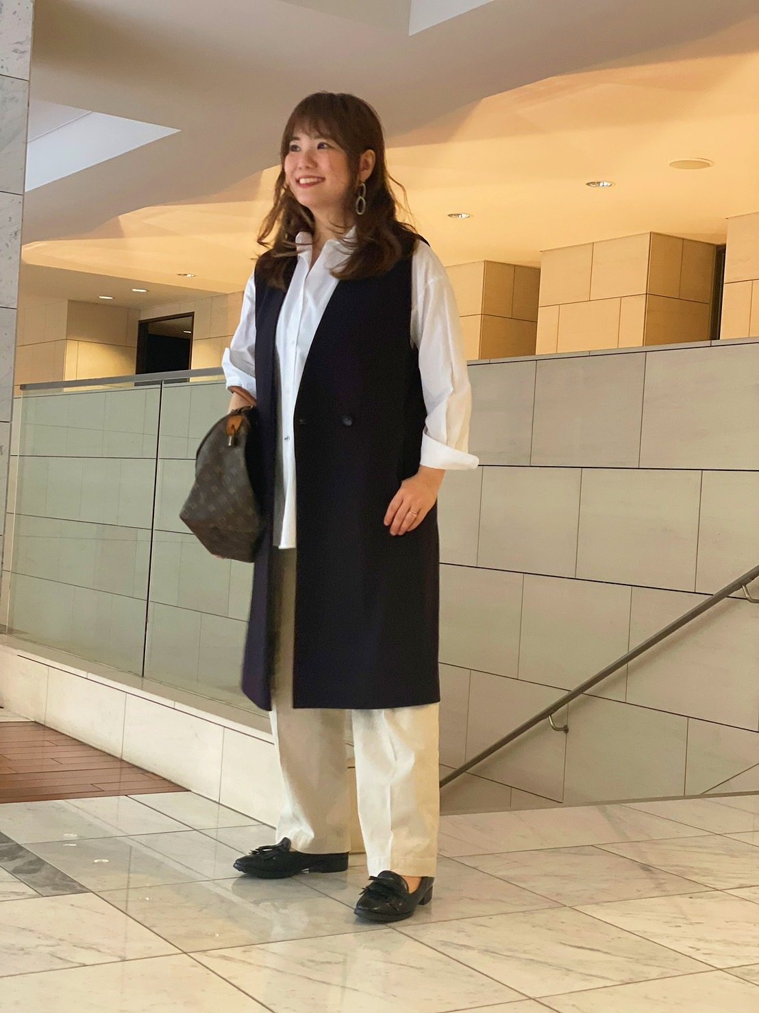 「この季節、着痩せアイテムとして一番推したいのがロングジレです。しかも、スーツみたいにしっかりした生地の濃紺のロングジレは、最高の着痩せ効果とジャケットレベルのきちんと感を与えてくれる優れもの。だから、ちょっと大事な仕事の日にも引っ張りだこ!ほら、ぽっちゃりでもちょっぴりカッコよく見せたい時ってあるじゃないですか(笑)。インナーは白シャツでコントラストをつけて、縦ラインを強調させてつつ、気になる身体の凹凸はしっかりカバー。ボトムスもシャツとトーンを合わせて。細身のボトムスを合わせたくなりますが、ここはワイドパンツ合わせが正解。上下のメリハリをつけず、ストンとしたシルエットにするのがコツです。ぺたんこヒールのローファーでも簡単にスタイルアップできますよ!」
