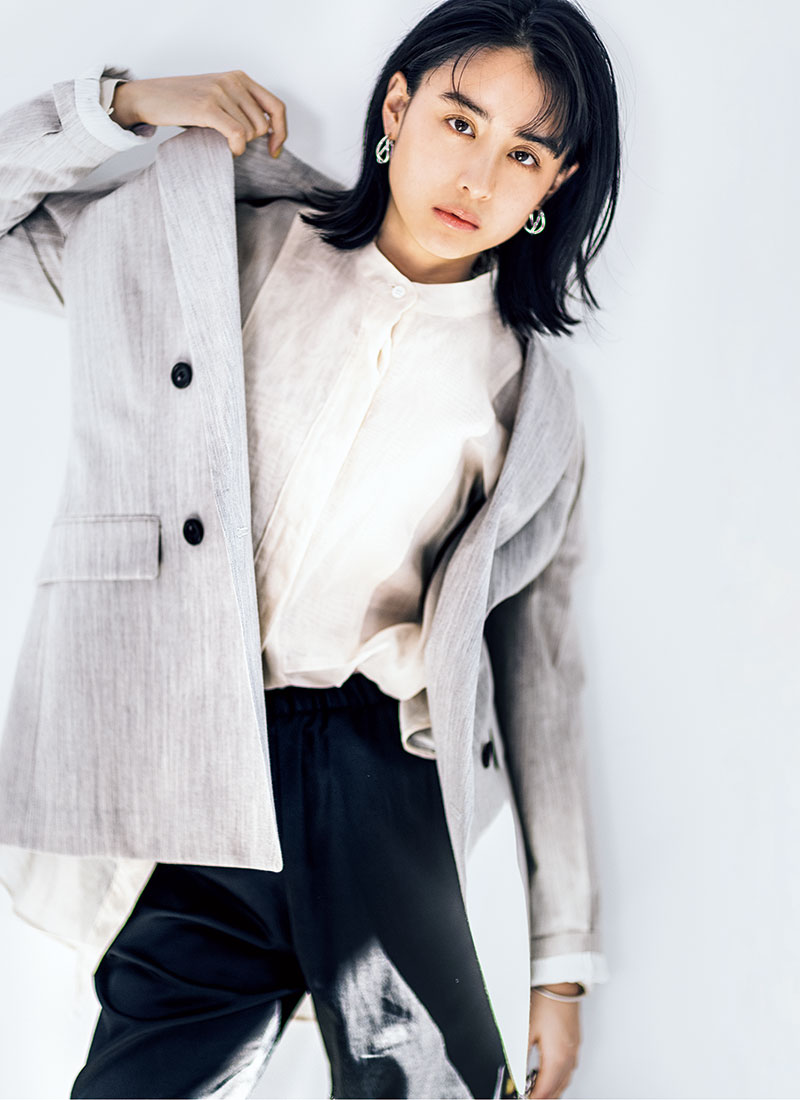仕立てのいいダブル合わせのジャケットは、ドライなベージュがリラクシーで素敵。シャツとパンツのシックな装いに重ねるジャケットは、いつものカジュアルMIXとは一線を画す新たなアプローチ。凛とした大人の着こなしを楽しみたい。ジャケット¥69,300(ebure/ebure GINZA SIX店)シャツ¥28,600(サクラ/インターリブ)パンツ¥28,600(RHC/RHCロンハーマン)ピアス¥96,800ブレスレット【手首側から】¥269,500¥132,000¥77,000(すべてウノアエレ/ウノアエレ ジャパン)